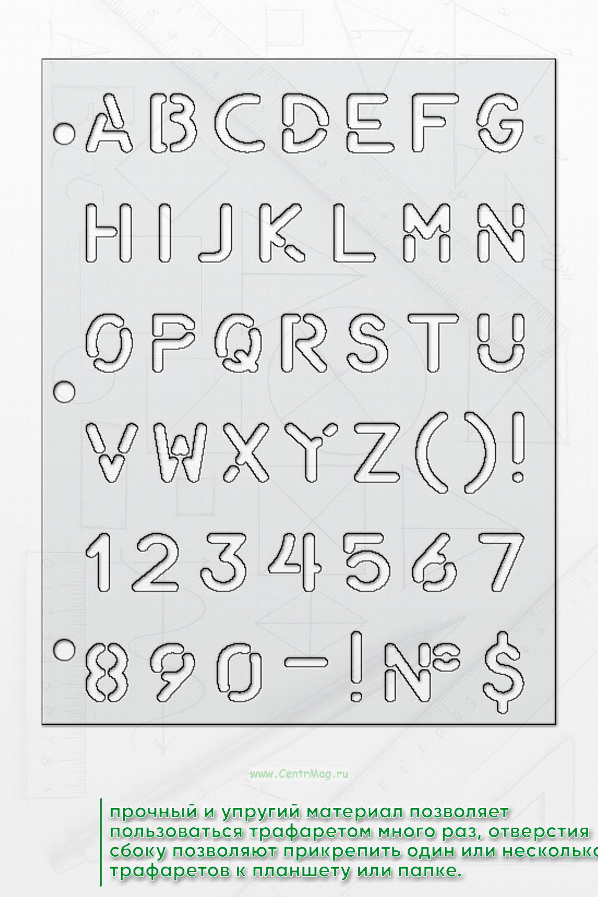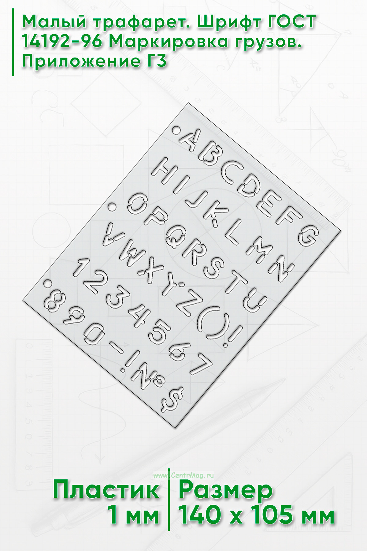 Шрифт для маркировки грузов соответствует ГОСТу 14192-96 (Приложение Г3). Прочный и упругий материал позволяет пользоваться трафаретом много раз. Отверстия сбоку позволяют прикрепить один или несколько трафаретов к планшету или папке.