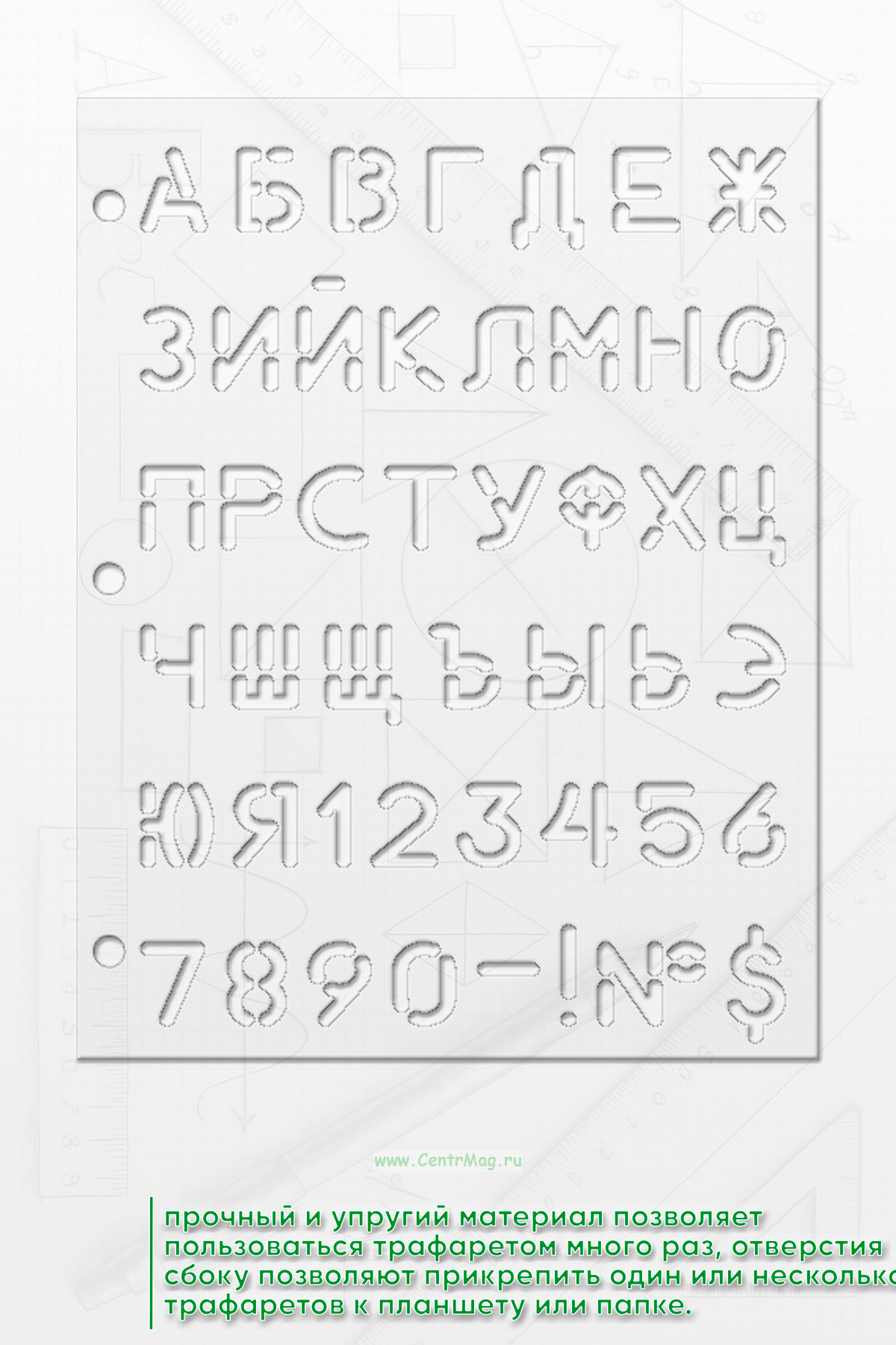 Шрифт для маркировки грузов соответствует ГОСТу 14192-96 (Приложение Г3). Прочный и упругий материал позволяет пользоваться трафаретом много раз. Отверстия сбоку позволяют прикрепить один или несколько трафаретов к планшету или папке.