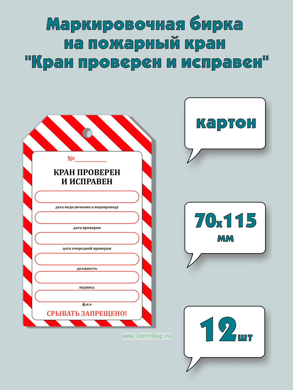 Маркировочная бирка на пожарный кран "Кран проверен и исправен" (картон с люверсом), 12 шт (100 руб.)