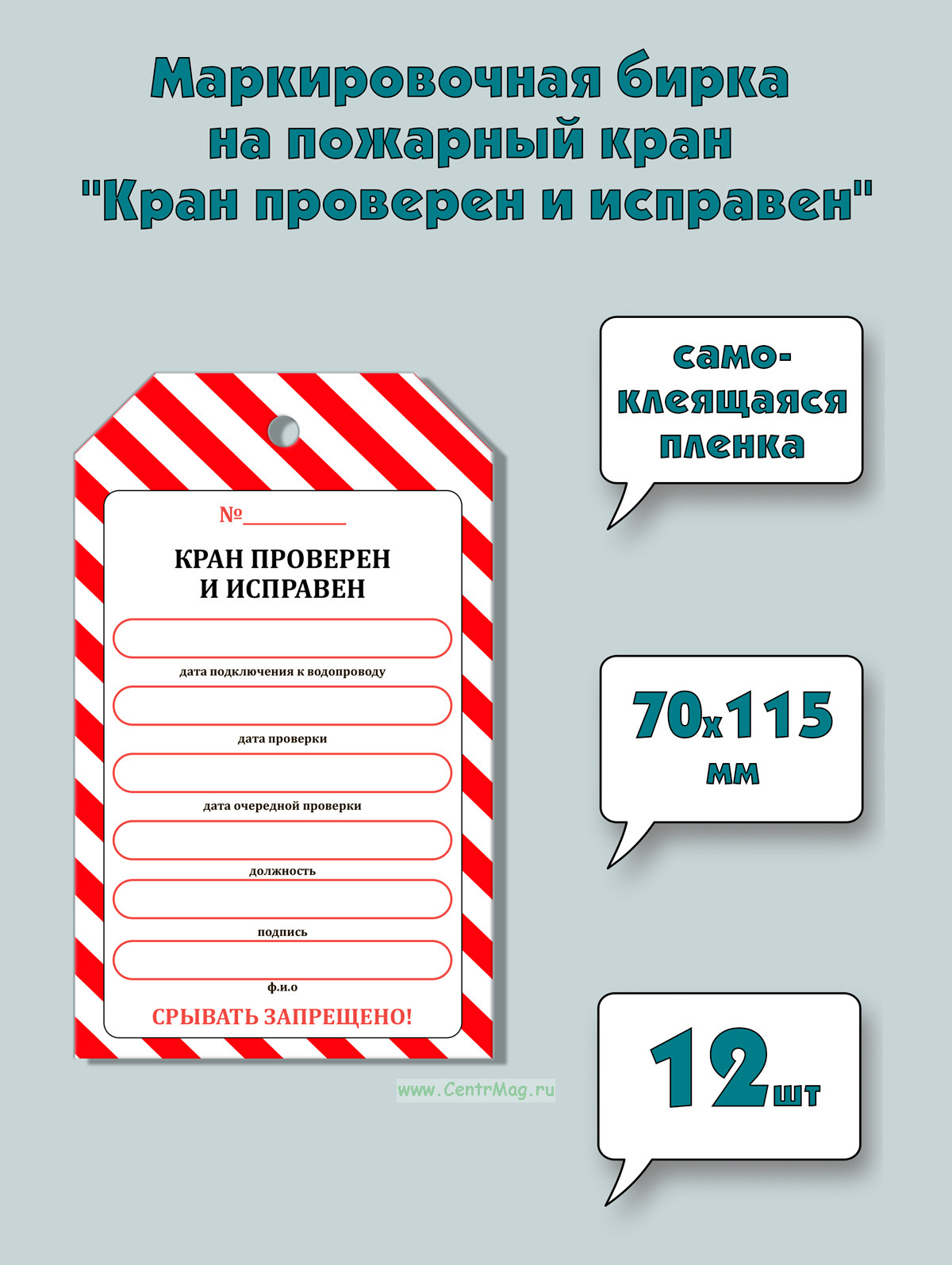Маркировочная бирка на пожарный кран "Кран проверен и исправен" (самоклеящаяся бумага), 12 шт