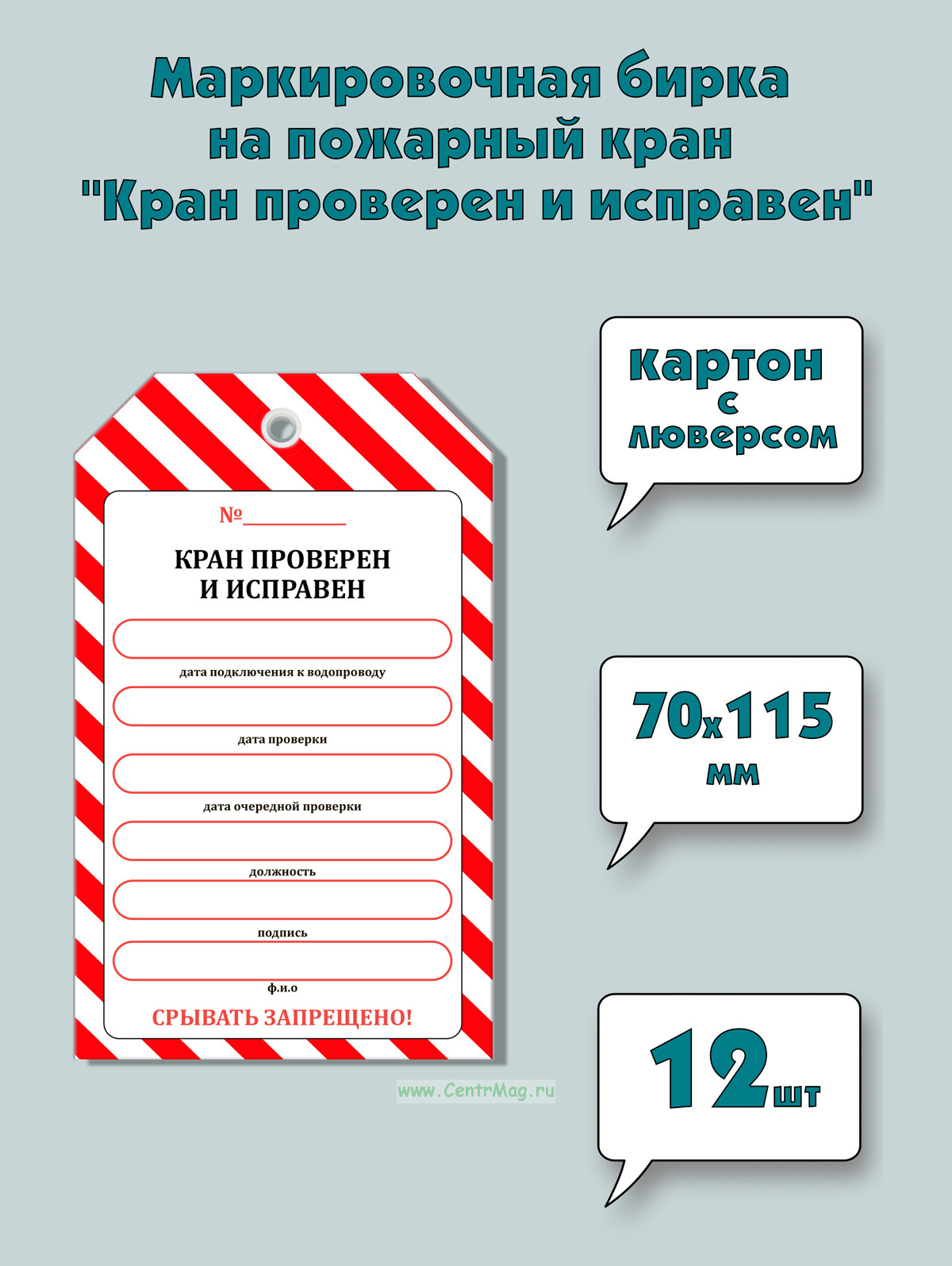 Маркировочная бирка на пожарный кран "Кран проверен и исправен" (картон с люверсом), 12 шт
