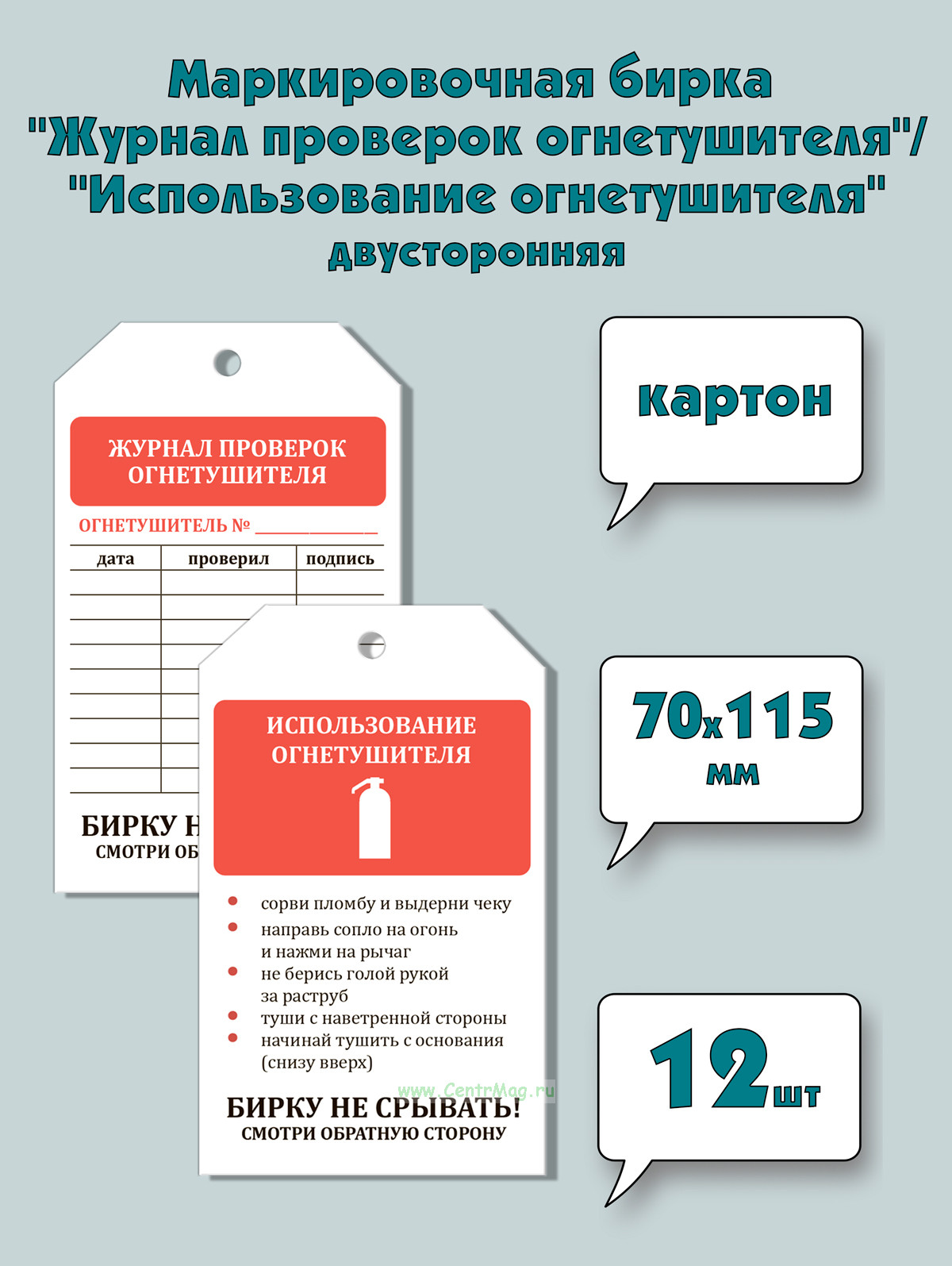 Маркировочная бирка "Журнал проверок огнетушителя"/"Использование огнетушителя" (картон), двусторонняя, 12 шт