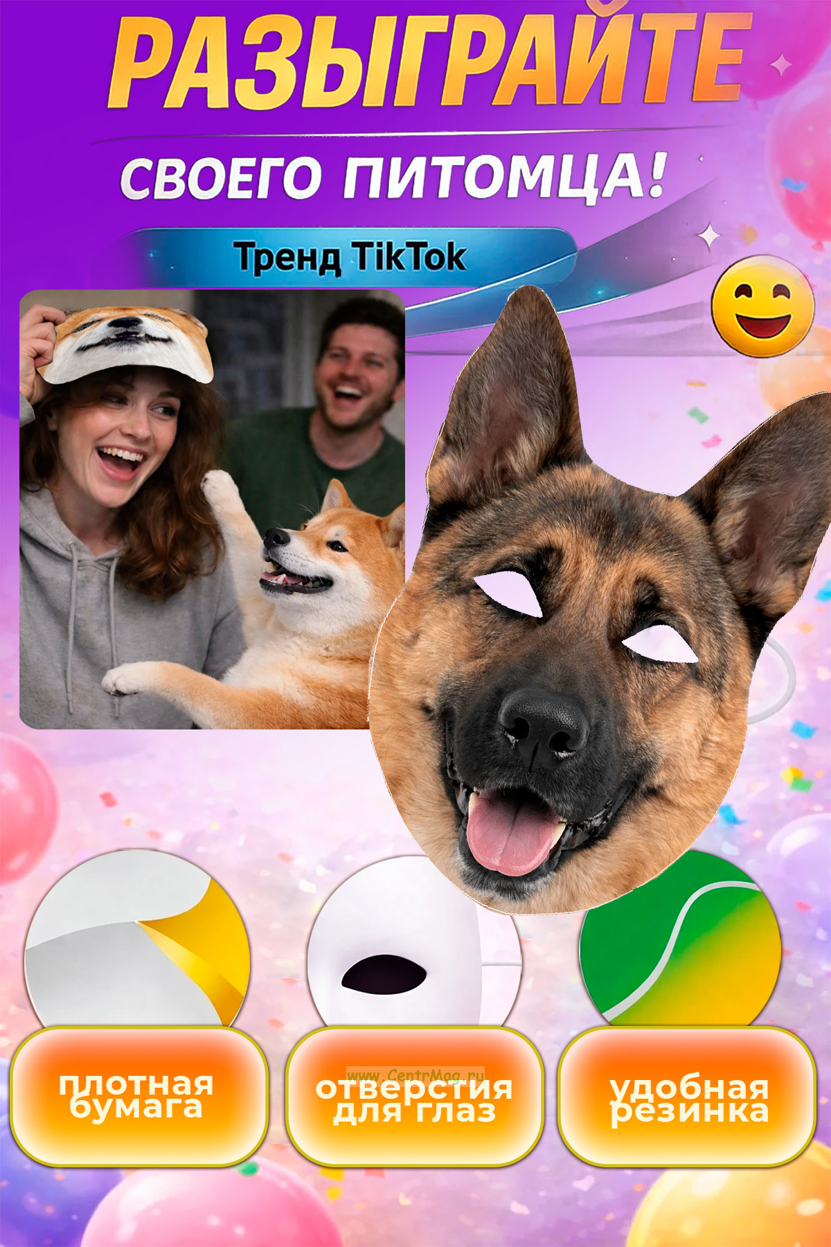 Подходит для вечеринок, корпоративов, фотосессий, TikTok, розыгрышей и вообще для всех ситуаций, где реальность слишком серьезная, а ты - нет. Маска полностью закрывает лицо, не мешает обзору и держится на удобной резинке.