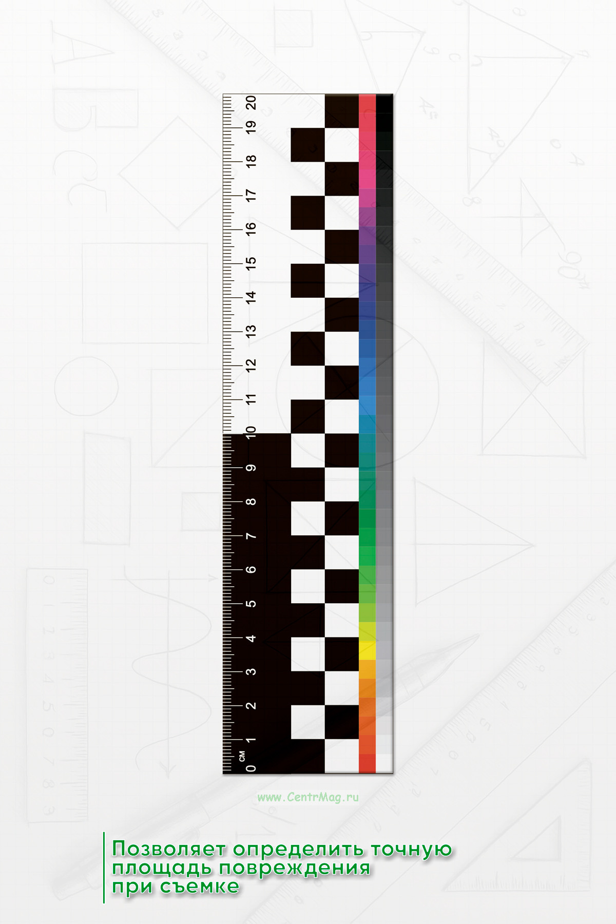 Линейка используется для определения площади объекта. Особенно часто используется в независимых экспертизах автомобилей для определения площади повреждения, так же может быть использована в других сферах деятельности. Позволяет определить точную площадь повреждения при съемке