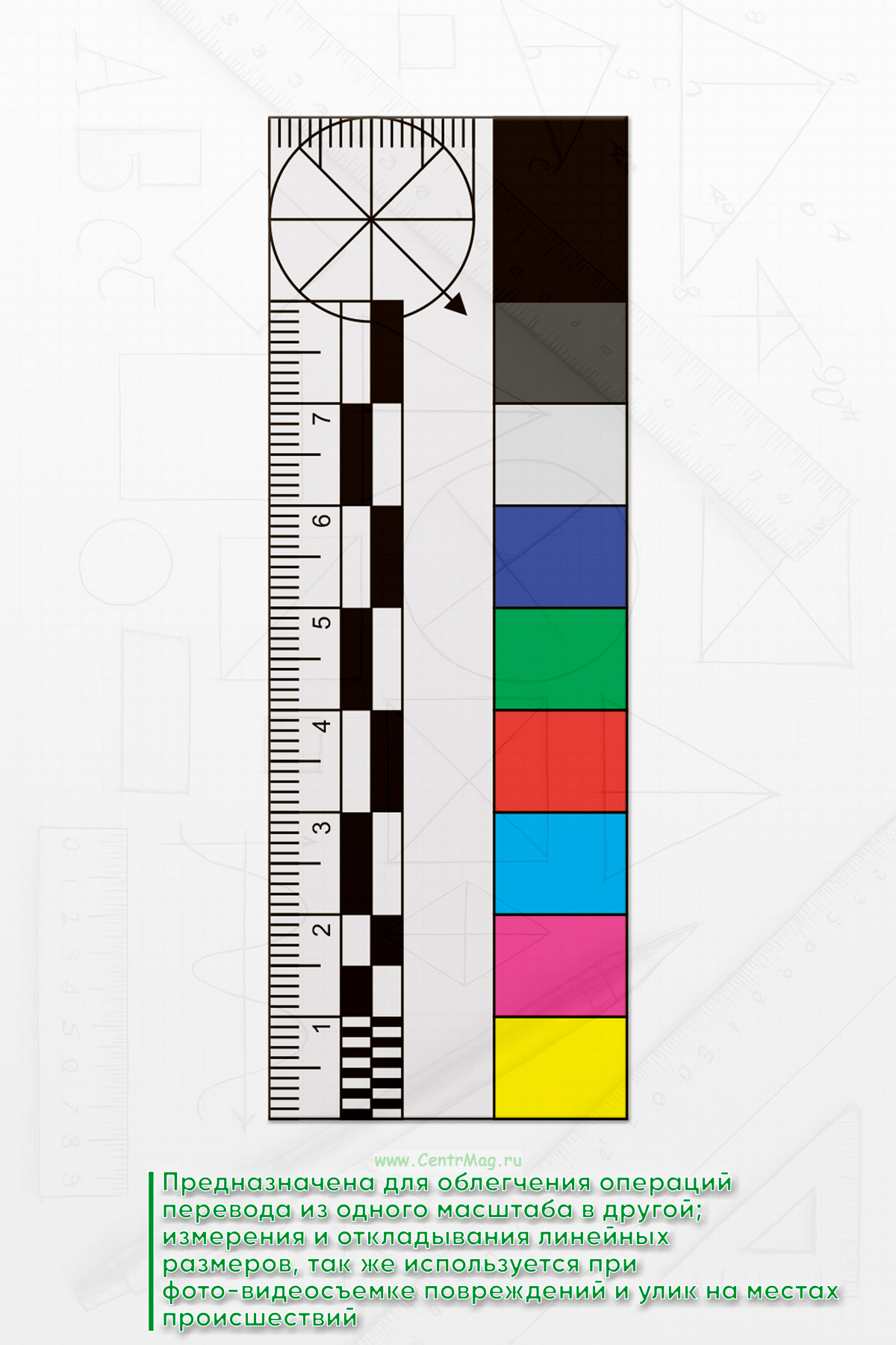 Линейка предназначена для облегчения операций перевода из одного масштаба в другой; измерения и откладывания линейных размеров, так же используется при фото-видеосъемке повреждений и улик на местах происшествий