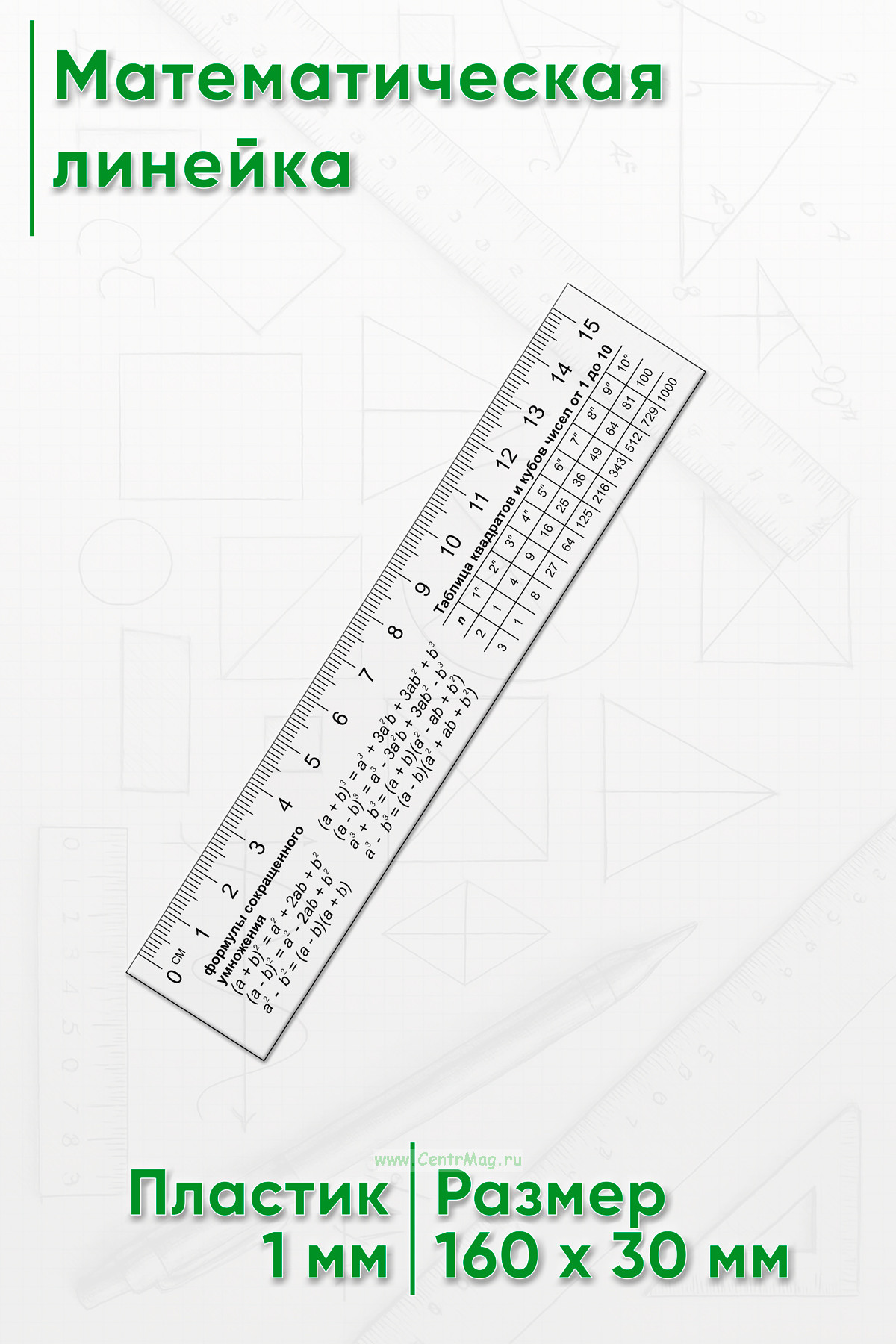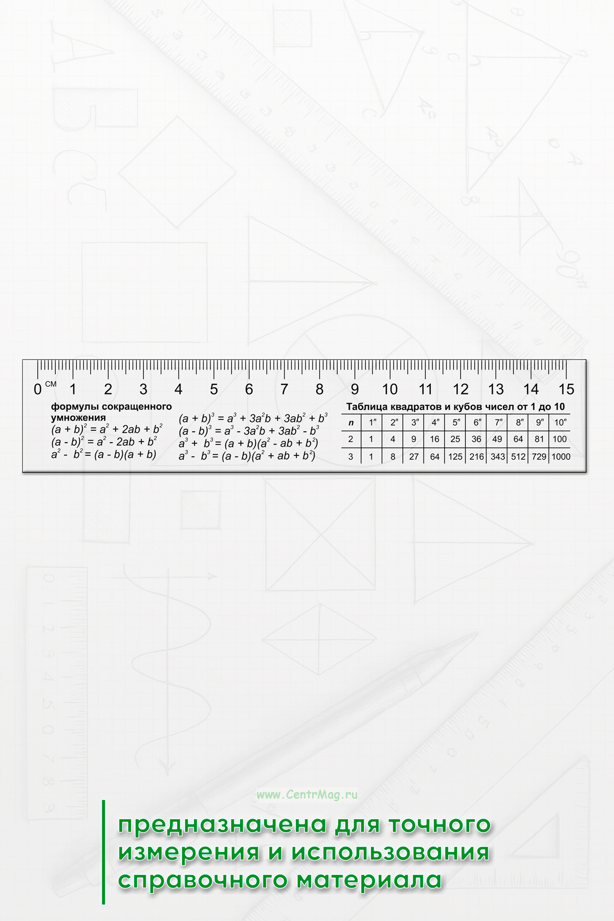 Математическая линейка предназначена для точного измерения и одновременного использования справочного материала. На поверхности линейки размещены основные формулы сокращенного умножения, а также таблица квадратов и кубов чисел от 1 до 10.