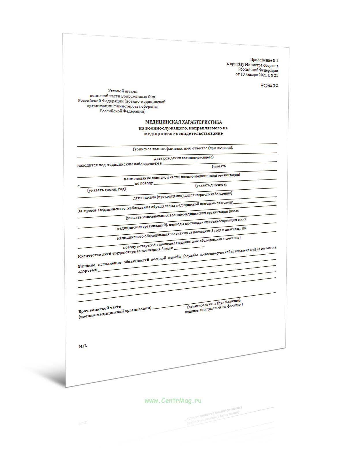Форма Медицинской характеристики на военнослужащего, направляемого на медицинское освидетельствование (N 2) соответствует Приложению 1 к Приказу Министра обороны РФ от 18.01.2021 N 21 "Об определении форм документации (кроме унифицированных форм медицинской документации), необходимых для деятельности военно-врачебных комиссий, созданных в Вооруженных Силах Российской Федерации, правил их заполнения, а также порядка оформления заключений военно-врачебных комиссий, созданных в Вооруженных Силах Российской Федерации"