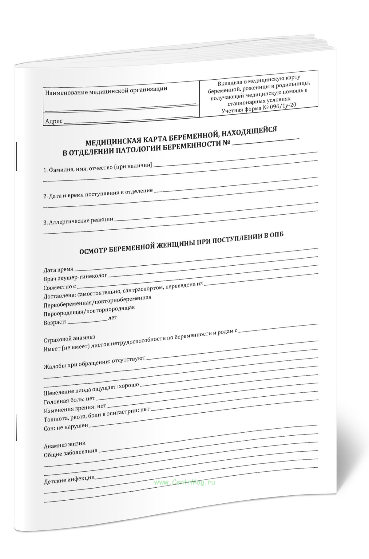 Медицинская карта беременной, роженицы и родильницы, получающей медицинскую помощь в стационарных условиях (Учетная форма N 096/у-20)