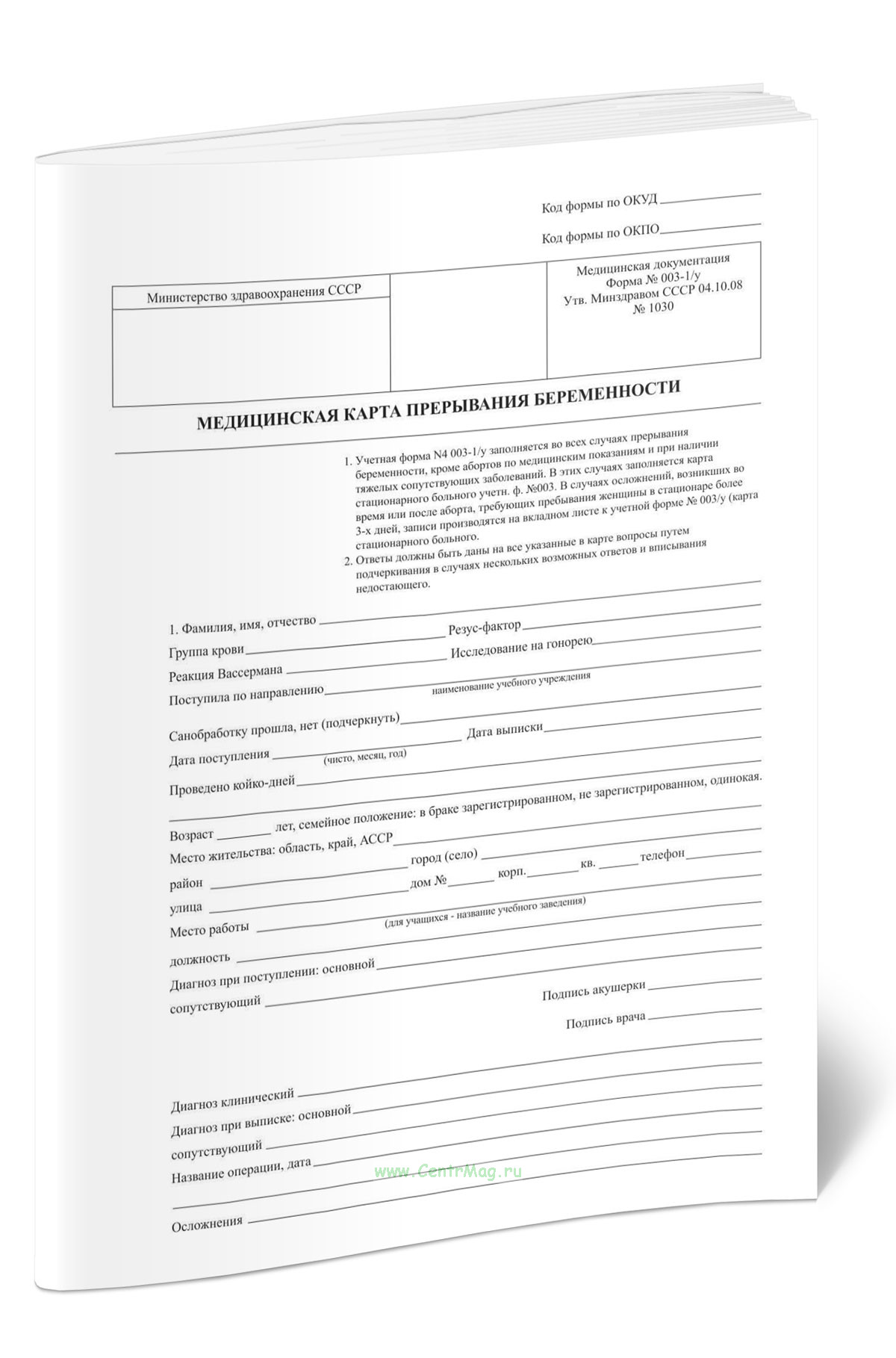 Медицинская карта прерывания беременности (Форма 003-1/у) продается только как чистый незаполненный бланк, без печатей и подписей соответствует 149-ФЗ от 27.07.2006
