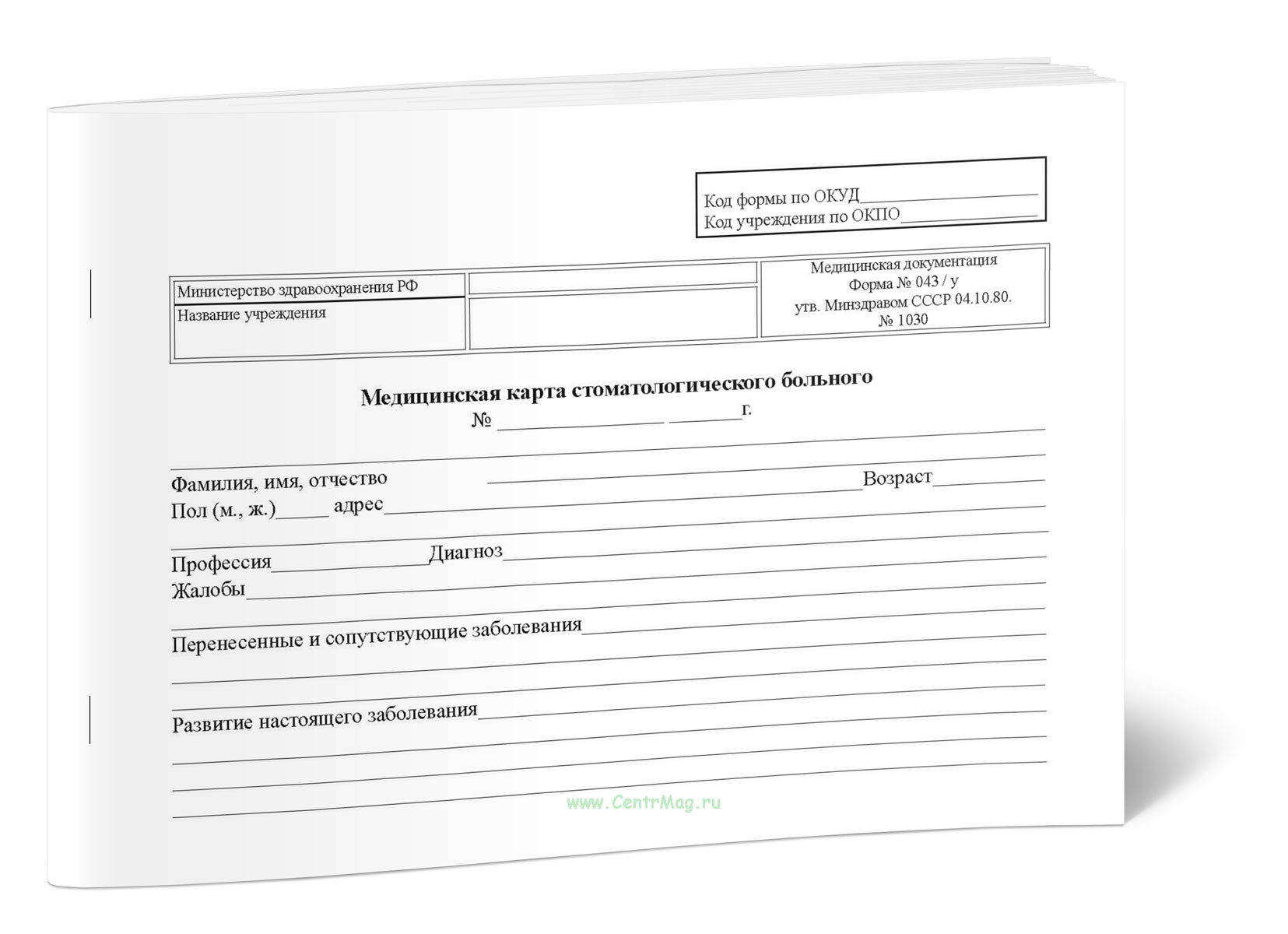 Медицинская карта стоматологического больного (Форма 043/у) продается только как чистый незаполненный документ, без печатей и подписей и соответствует 149-ФЗ от 27.07.2006