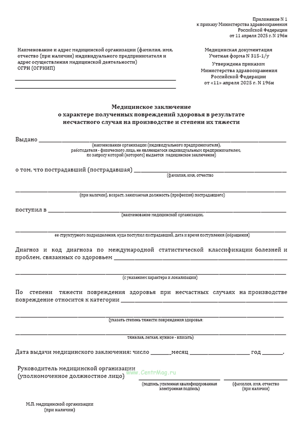 Форма Медицинского заключения о характере полученных повреждений здоровья в результате несчастного случая на производстве и степени их тяжести (N 315-1/у) соответствует Приложению N 1 к Приказу Минздрава России от 11.04.2025 N 196н "Об утверждении учетной формы N 315-1/у "Медицинское заключение о характере полученных повреждений здоровья в результате несчастного случая на производстве и степени их тяжести", учетной формы N 316-1/у "Медицинское заключение об установлении заключительного диагноза пострадавшего в результате несчастного случая на производстве".