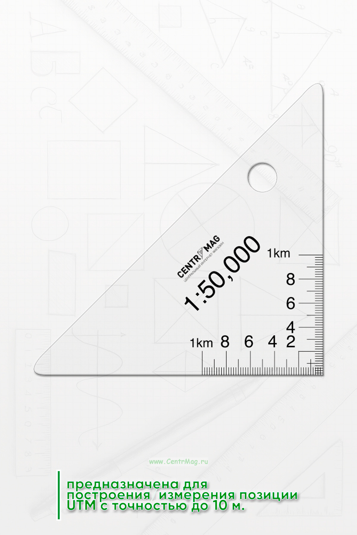 Мини-угловая линейка предназначена для карт, масштабом 1:50 000. Нижний край располагается внизу сетки карты, что позволяет легко выравнивать инструмент параллельно линиям сетки.