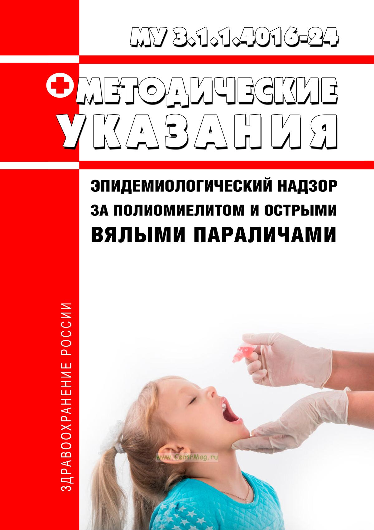 "МУ 3.1.1.4016-24 Эпидемиологический надзор за полиомиелитом и острыми вялыми параличами" утверждены руководителем Федеральной службы по надзору в сфере защиты прав потребителей и благополучия человека, Главным государственным санитарным врачом Российской Федерации А.Ю.Поповой 18 марта 2024 г.