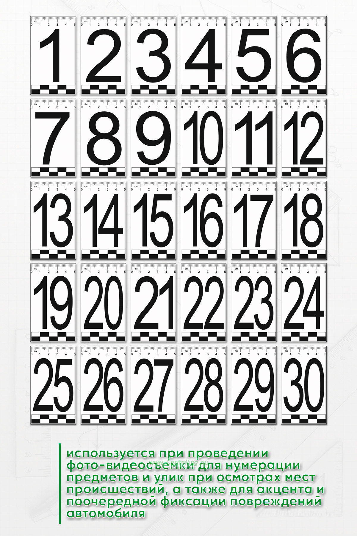 Набор используется при проведении фото-видеосъемки для нумерации предметов и улик при осмотрах мест происшествий, а также для акцента и поочередной фиксации повреждений автомобиля
