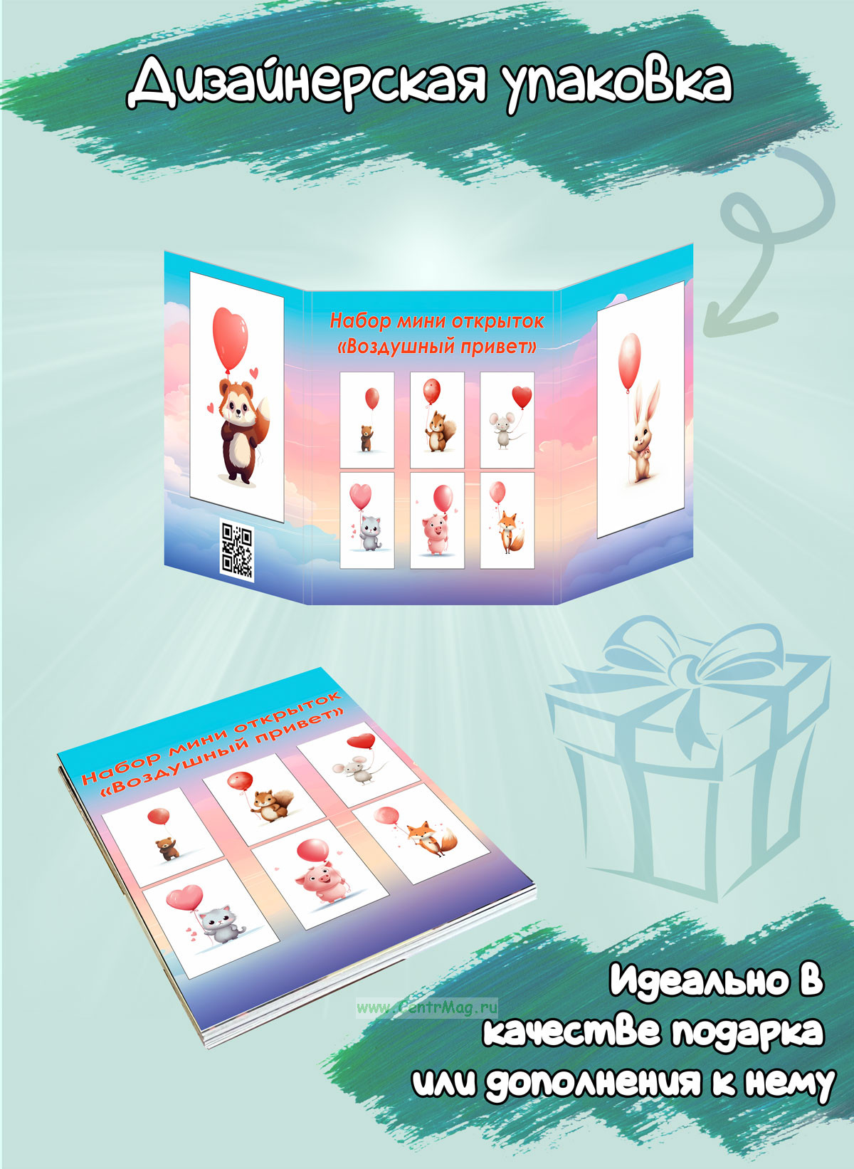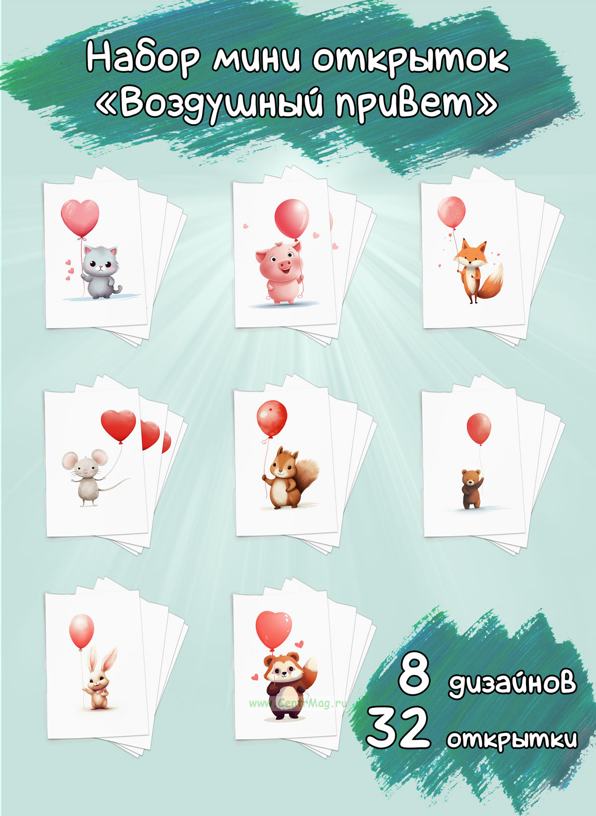 Набор мини открыток "Воздушный привет" - это невероятно милые открытки, которые точно смогут поднять настроение и принести радость своим получателям. На каждой открытке из набора изображено очаровательное животное, которое держит в руках воздушный шарик. Эти яркие, красочные изображения создадут атмосферу праздника и радости.