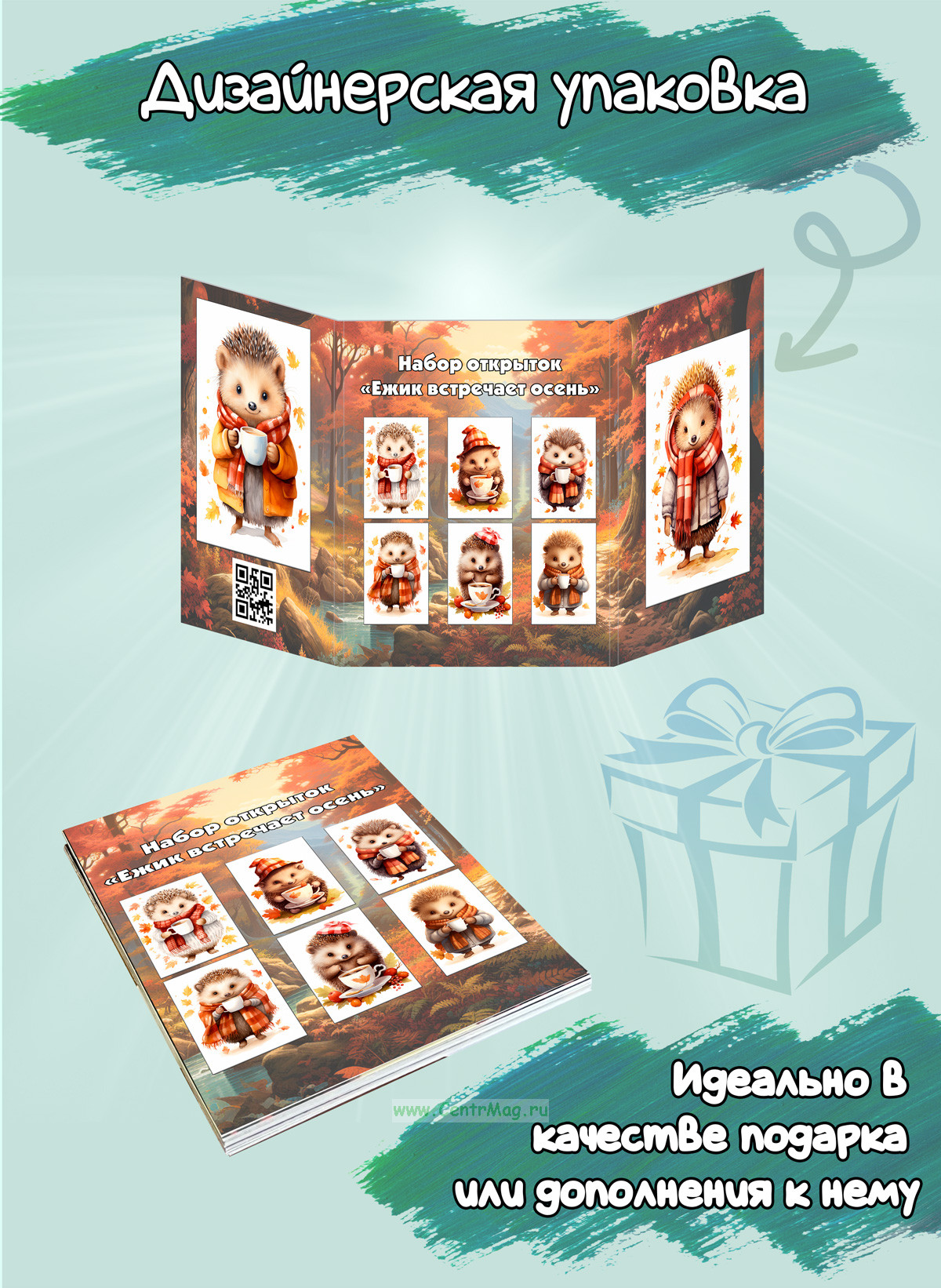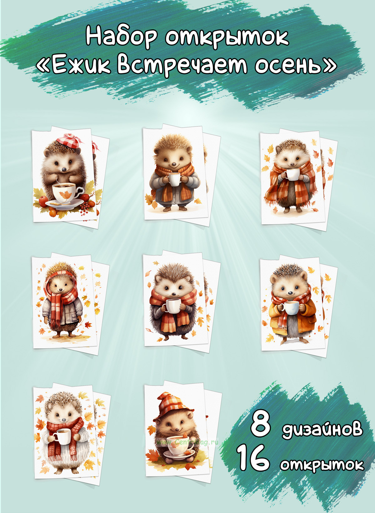 См. также Набор мини открыток "Ежик встречает осень" меньшего размера.