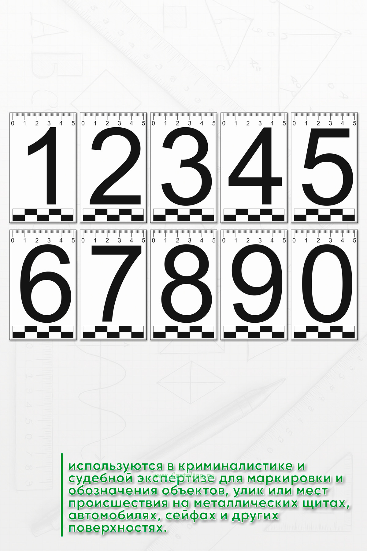 Комплект криминалистических номерков на магнитной основе от 0 до 9 широко используются в криминалистике и судебной экспертизе для маркировки и обозначения объектов, улик или мест происшествия на металлических щитах, автомобилях, сейфах и других поверхностях.