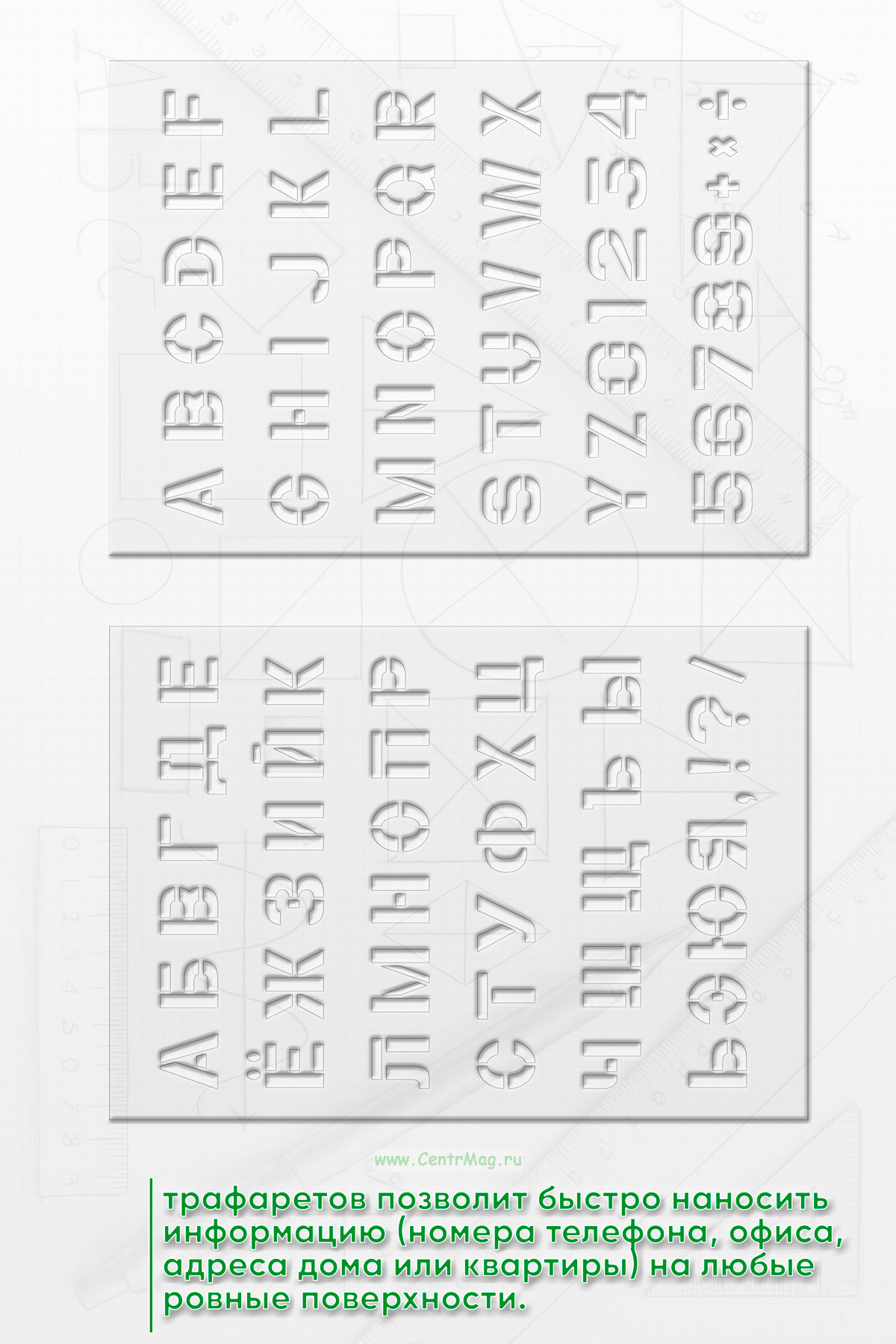 Набор трафаретов позволит быстро наносить информацию (номера телефона, офиса, адреса дома или квартиры) на любые ровные поверхности. Включает в себя буквы русского и английского алфавита, а также набор знаков и цифр от 0 до 9. Высота каждого символа 24 мм (буквы Д, Ё, Й, Ц, Щ имеют высоту 27 мм). Набор представляет собой 2 трафарета формата А4. Прочный и гибкий материал позволяет пользоваться набором трафаретов много раз.