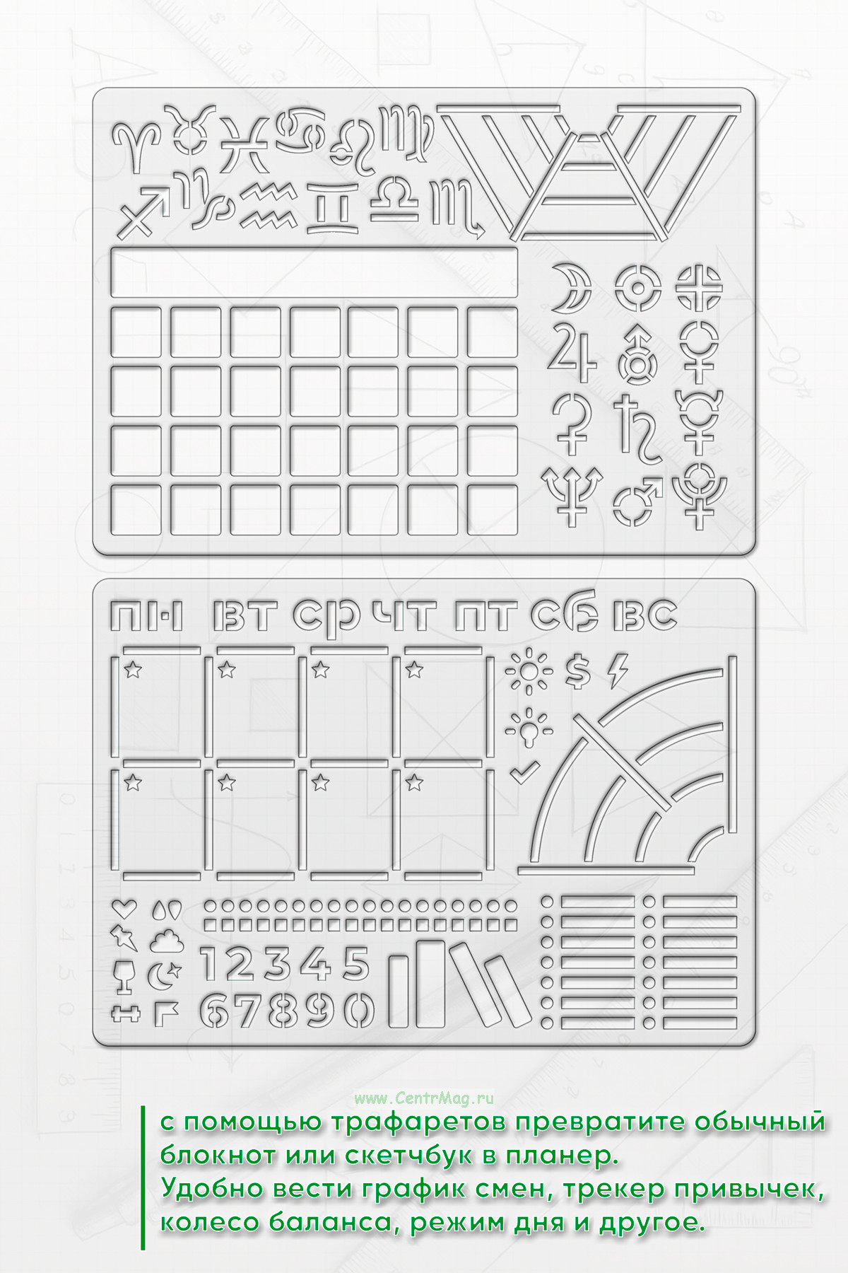 Набор из трафаретов для ежедневника и натальных карт. С их помощью превратите обычный блокнот или скетчбук в планер. Удобно вести график смен, трекер привычек, колесо баланса, режим дня, планирование бюджета, мотиватор, дневник малыша, планы и цели, натальные карты