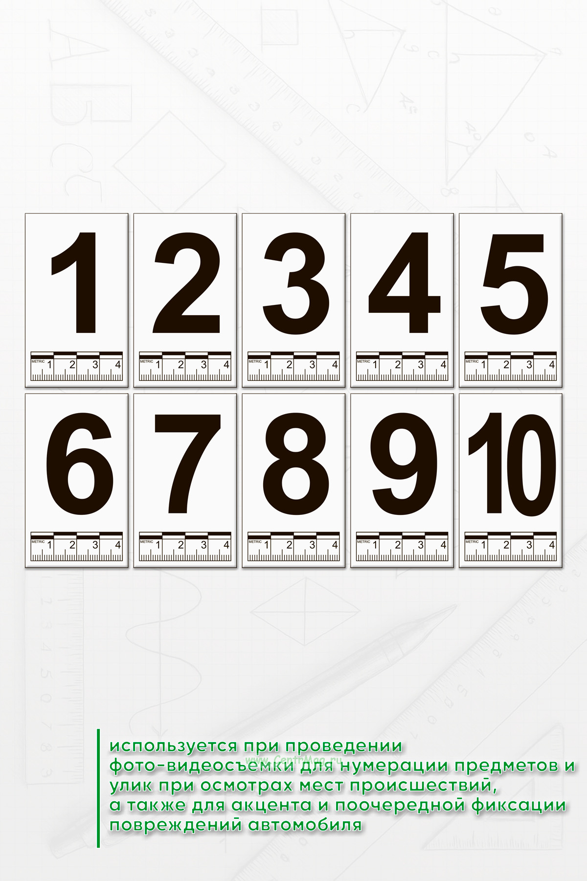 Набор используется при проведении фото-видеосъемки для нумерации предметов и улик при осмотрах мест происшествий, а также для акцента и поочередной фиксации повреждений автомобиля