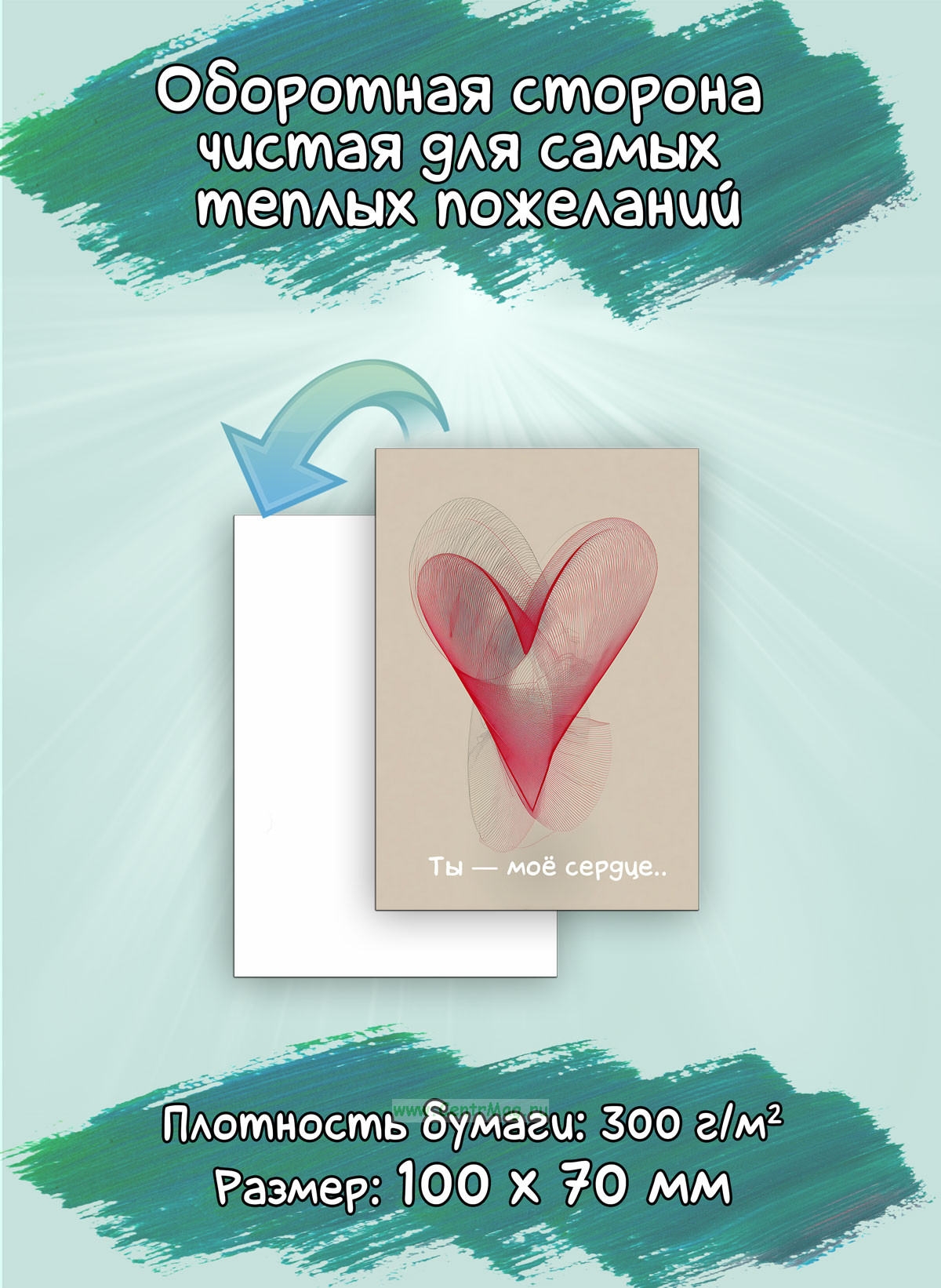 Оборотная сторона чистая, что позволит добавить самое теплое индивидуальное пожелание для ваших близких. Помимо этого, мини открытки можно использовать как бирку для подарка, или в качестве вложения в заказ.