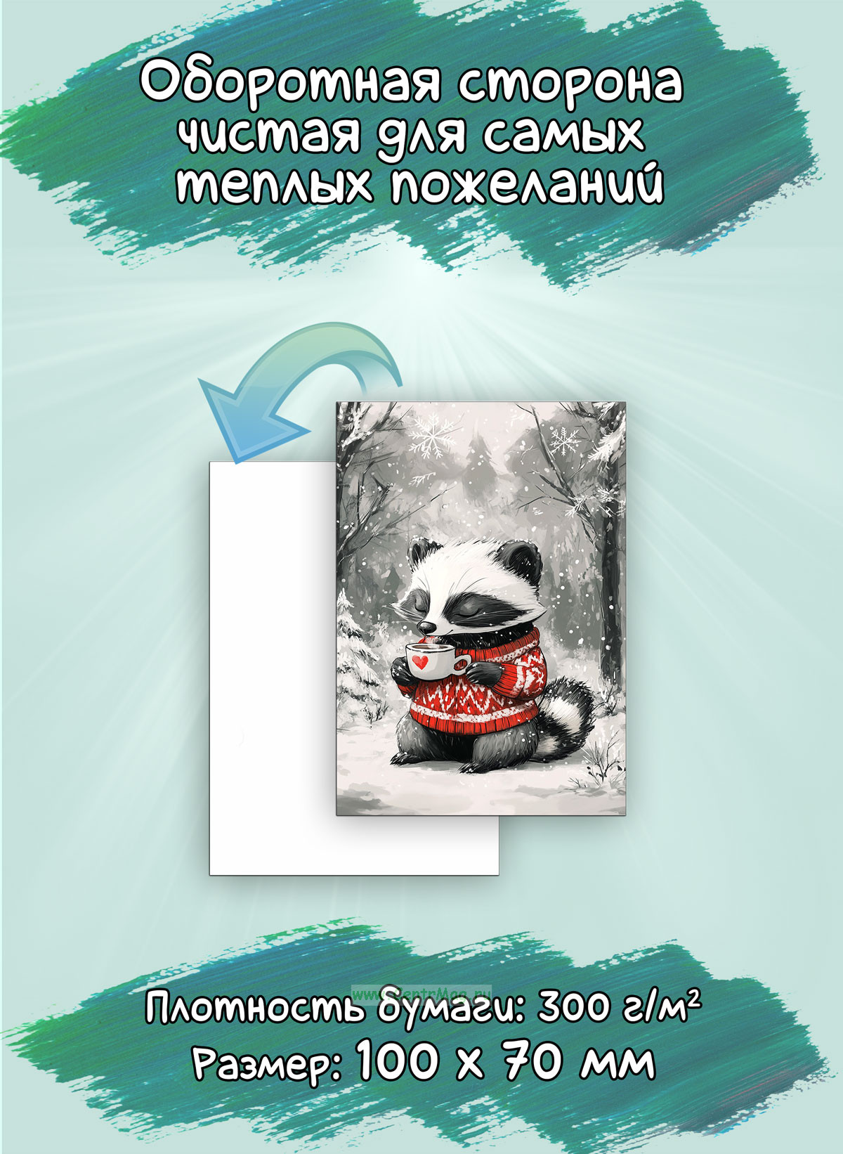 Оборотная сторона чистая, что позволит добавить самое теплое индивидуальное пожелание для ваших близких. Помимо этого, мини открытки можно использовать как бирку для подарка, или в качестве вложения в заказ.