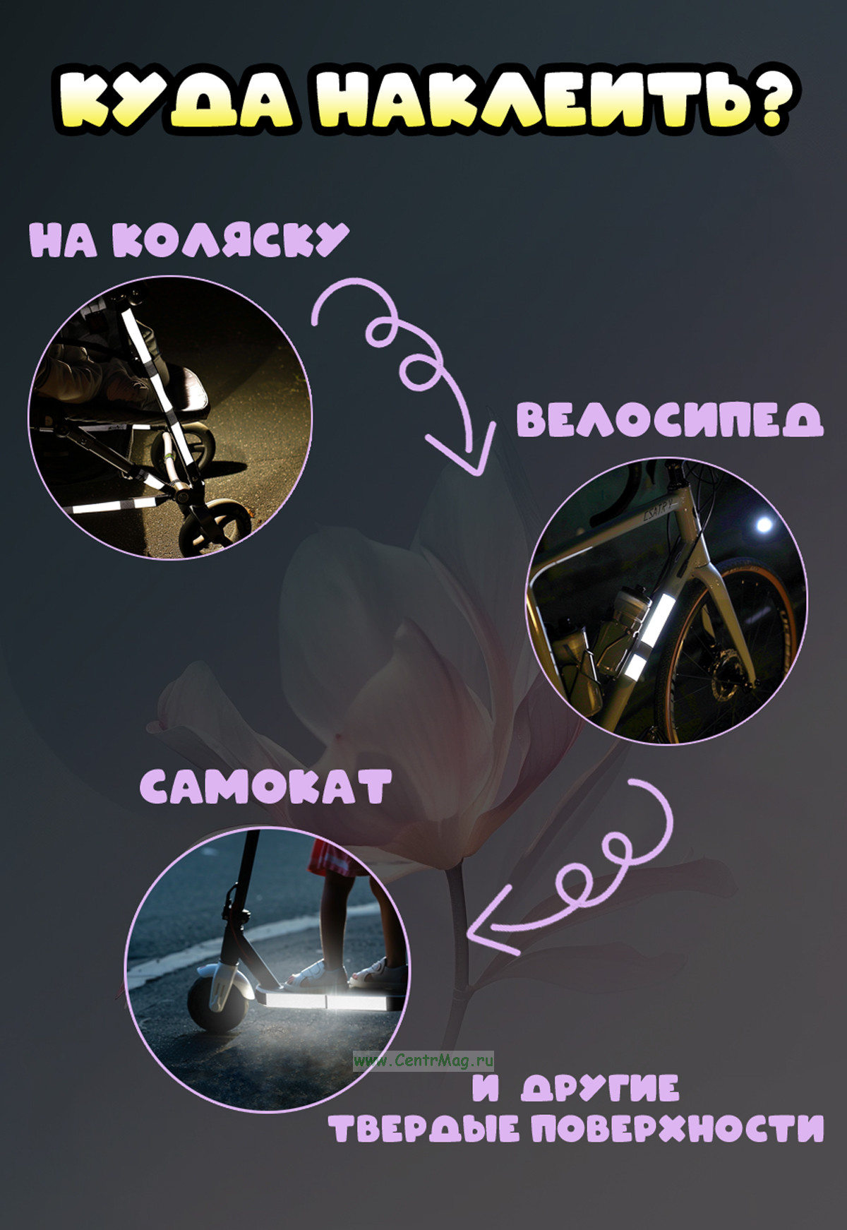 Светоотражающие наклейки — это удобное и эффективное решение для повышения безопасности на дороге и в условиях низкой видимости. Эти наклейки идеально подходят для использования на велосипедах, самокатах, колясках, детских колясках и других объектах, которые требуют дополнительной видимости в темное время суток или при плохих погодных условиях. Они изготовлены из высококачественного светоотражающего материала, который обеспечивает отличную видимость даже на расстоянии. Благодаря самоклеящемуся слою наклейки легко наносятся на различные поверхности и надежно держатся, не теряя своих свойств даже при длительном воздействии дождя, солнца или перепадов температуры. Эти наклейки — простой и эффективный способ улучшить безопасность в любых условиях.