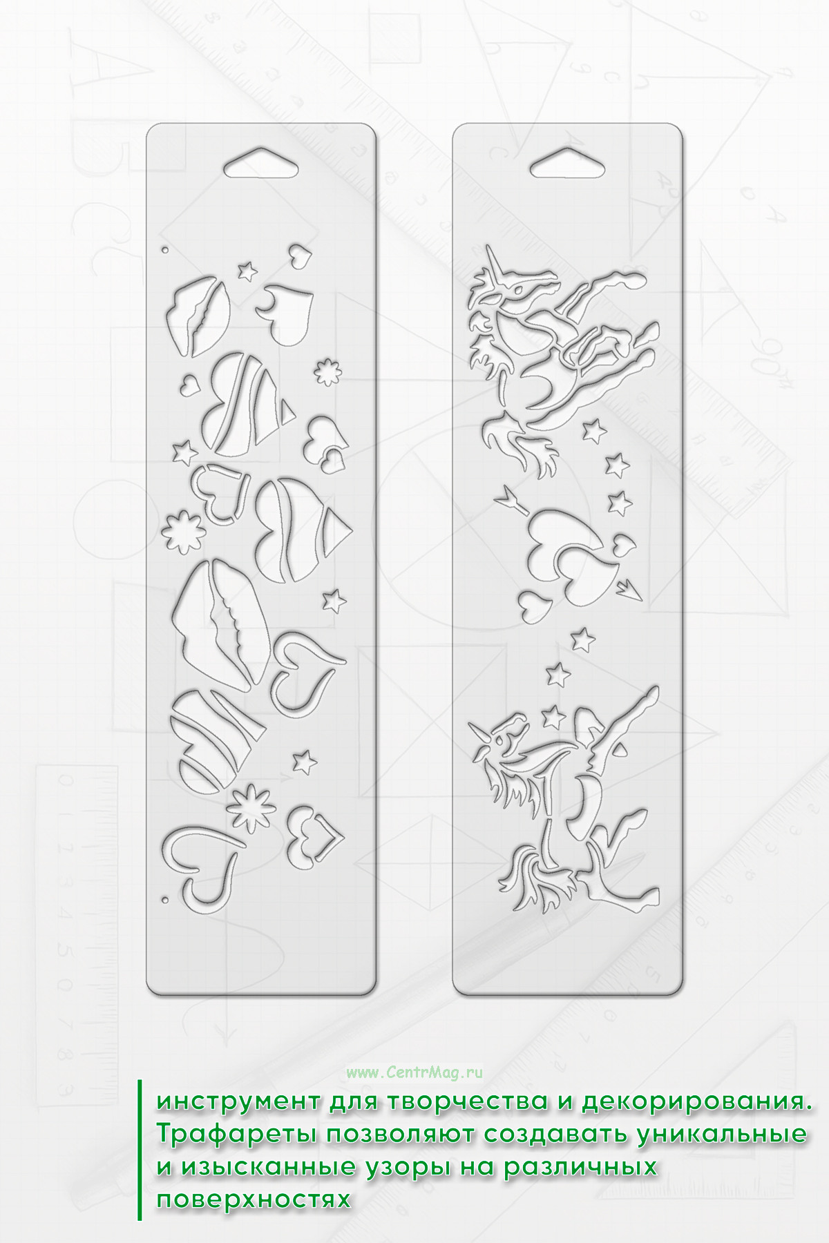 Набор трафаретов — это отличный инструмент для творчества и декорирования. Трафареты позволяют создавать уникальные и изысканные узоры на различных поверхностях: бумага, ткань, дерево или стекло. Возможно использовать для декорирования страниц, обложек в скрапбукинге, готовых изделий в технике декупаж, упаковок, открыток, альбомов
