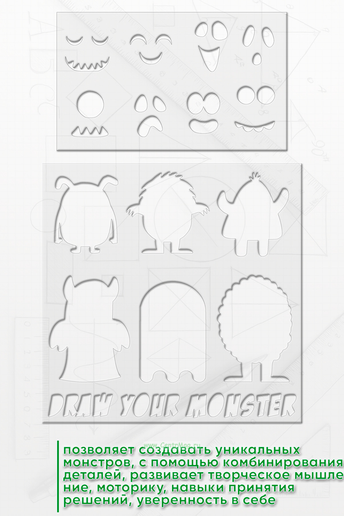 Набор трафаретов "Создай монстра" - это творческое занятие, которое позволяет создавать уникальных монстров, с помощью комбинирования деталей.