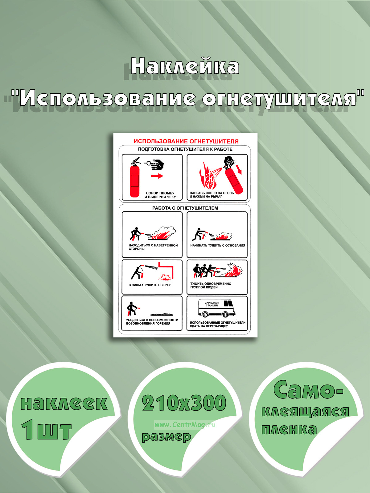Наклейка "Использование огнетушителя" указывает сотрудникам и посетителям, где находится огнетушитель и как его правильно использовать в случае пожарной опасности.