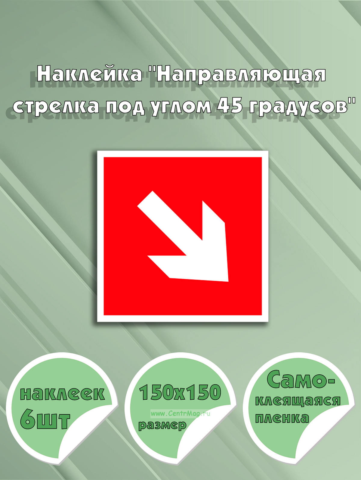 Наклейка "Направляющая стрелка под углом 45 градусов" показывает направление движения или эвакуационного пути, отклоняющееся под углом 45 градусов от вертикали или горизонтали. Это особенно полезно в сложных или изогнутых пространствах.