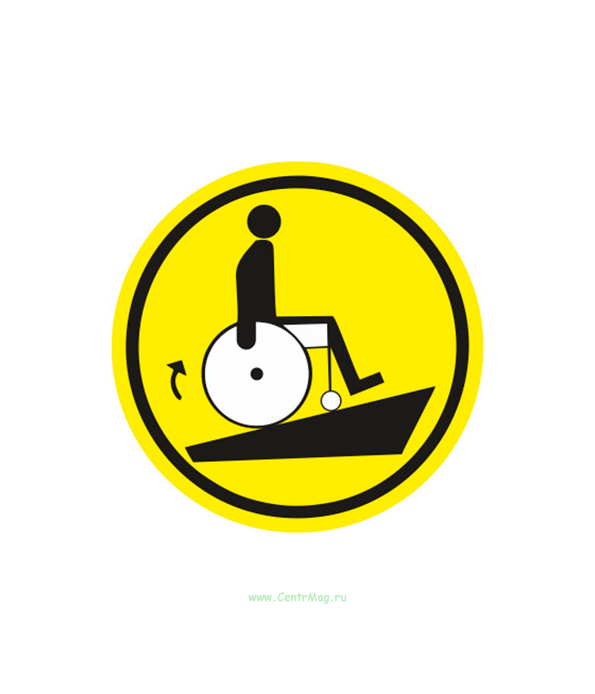 Наклейка предназначена для предупреждения о крутых подъёмах или склонах, которые могут представлять опасность для людей в инвалидных колясках, вызывая риск потери контроля или опрокидывания.