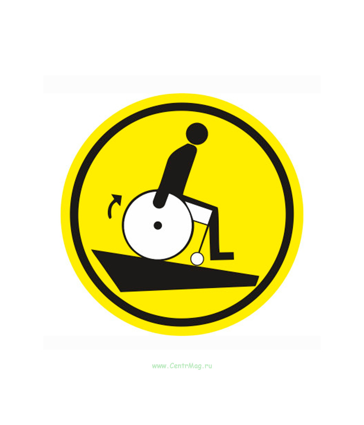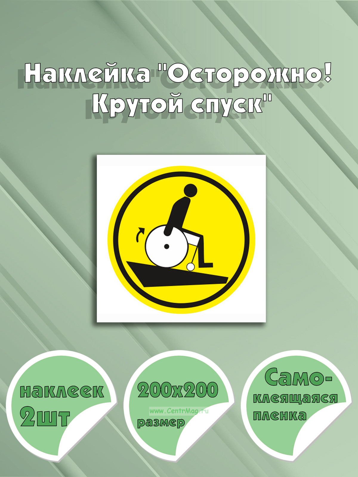 Наклейка предназначена для предупреждения о крутых спусках или уклонах, которые могут представлять опасность для людей в инвалидных колясках, вызывая риск неконтролируемого движения или опрокидывания.