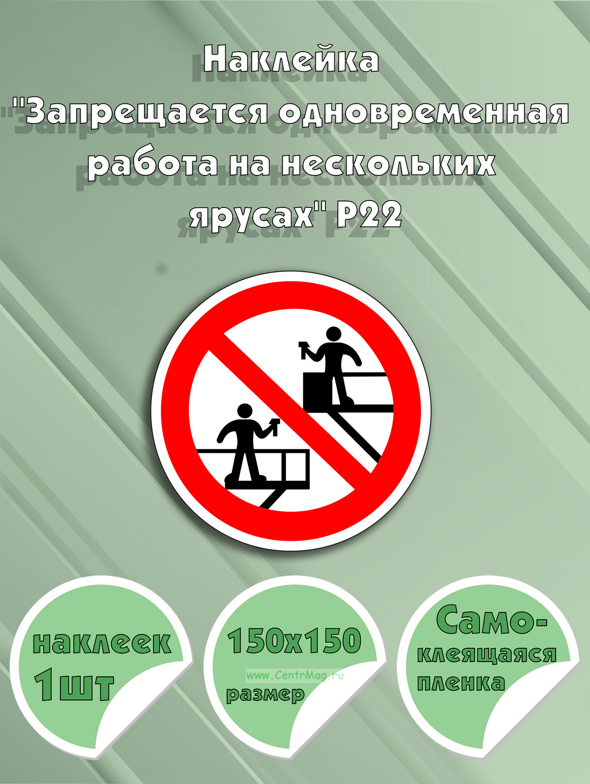 Наклейка «Запрещается одновременная работа на нескольких ярусах» Р22 предназначена для предупреждения работников о запрете выполнять работы одновременно на разных ярусах, уровнях или этажах строительных конструкций, технических сооружений или других многоуровневых объектов.
