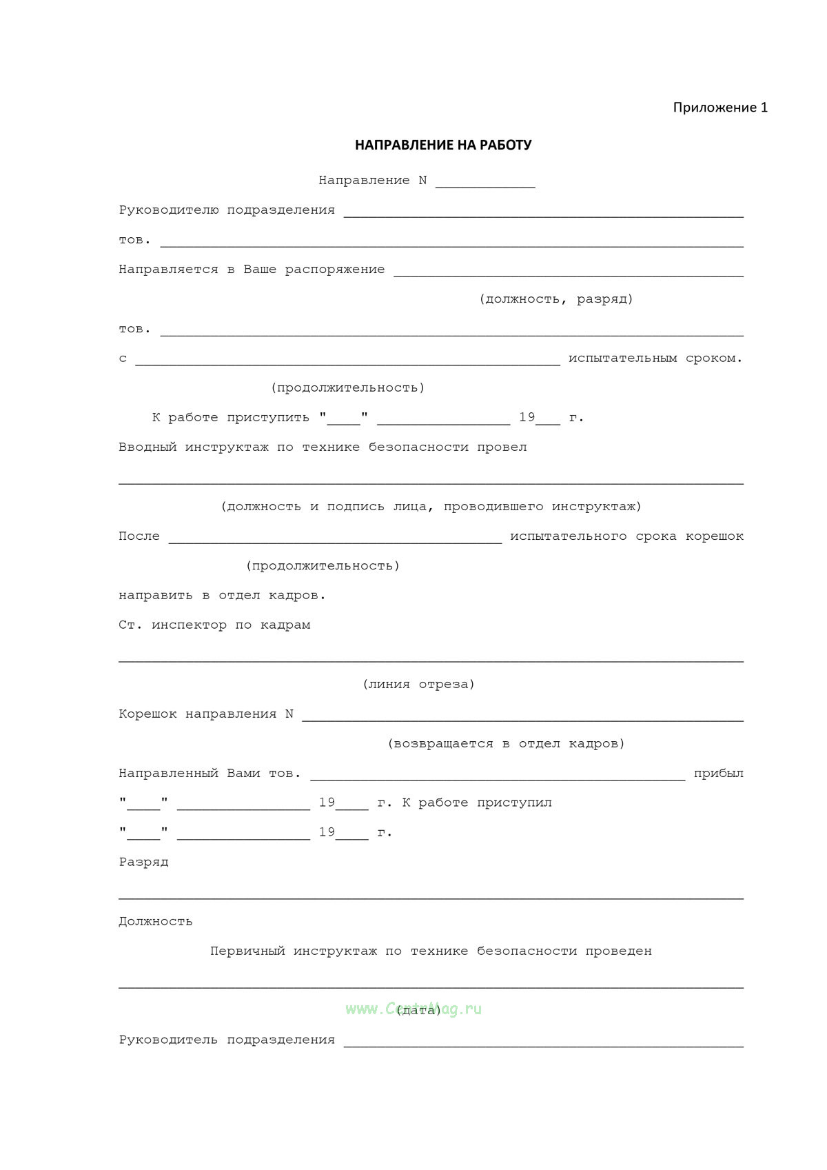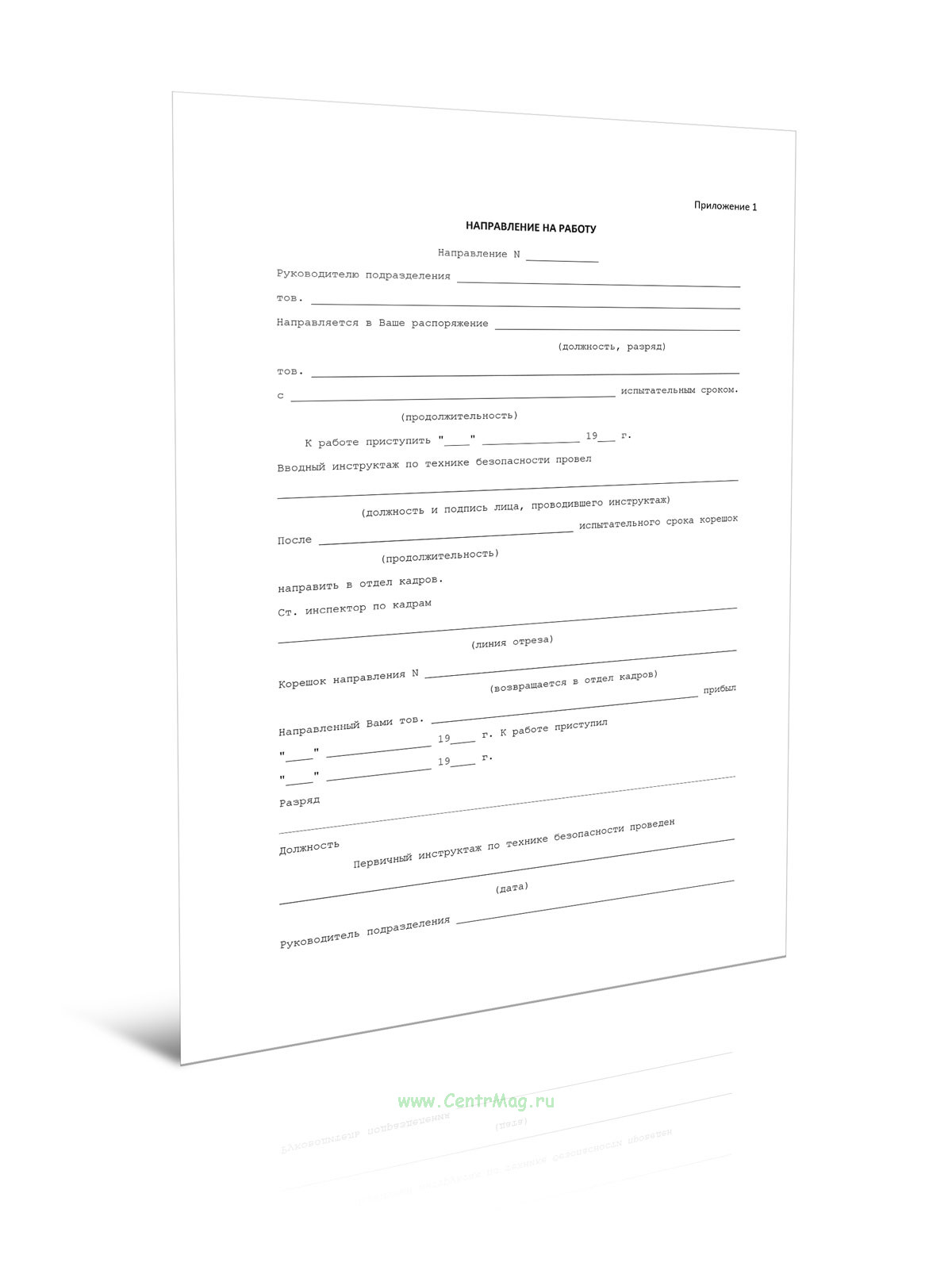 Направление на работу предназначена для официального оформления направления сотрудника в конкретное подразделение организации. В нем указывается, кого именно направляют, на какую должность и с каким разрядом, а также фиксируется дата начала работы и продолжительность испытательного срока. В документе подтверждается проведение вводного инструктажа по технике безопасности, а после окончания испытательного срока отрывной корешок возвращается в отдел кадров. Таким образом, форма служит средством контроля и учета при приеме нового работника и начале его трудовой деятельности.