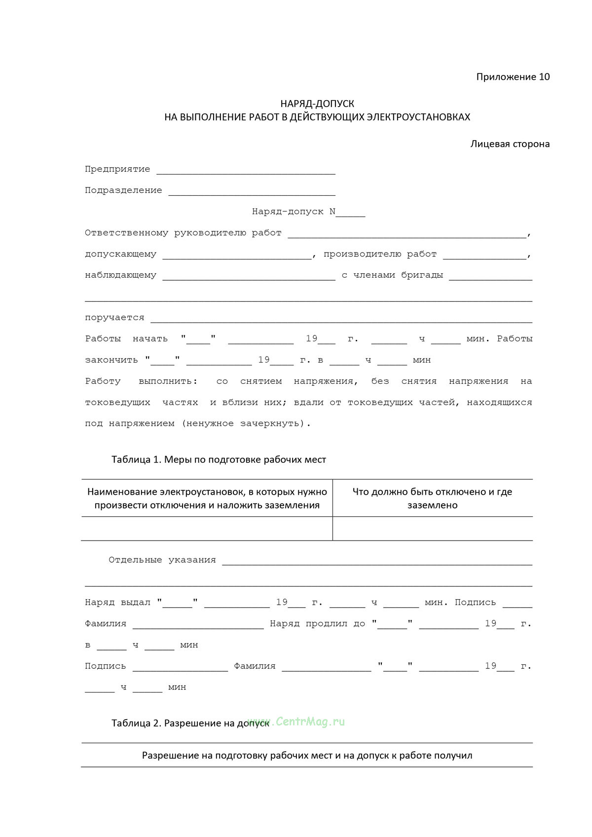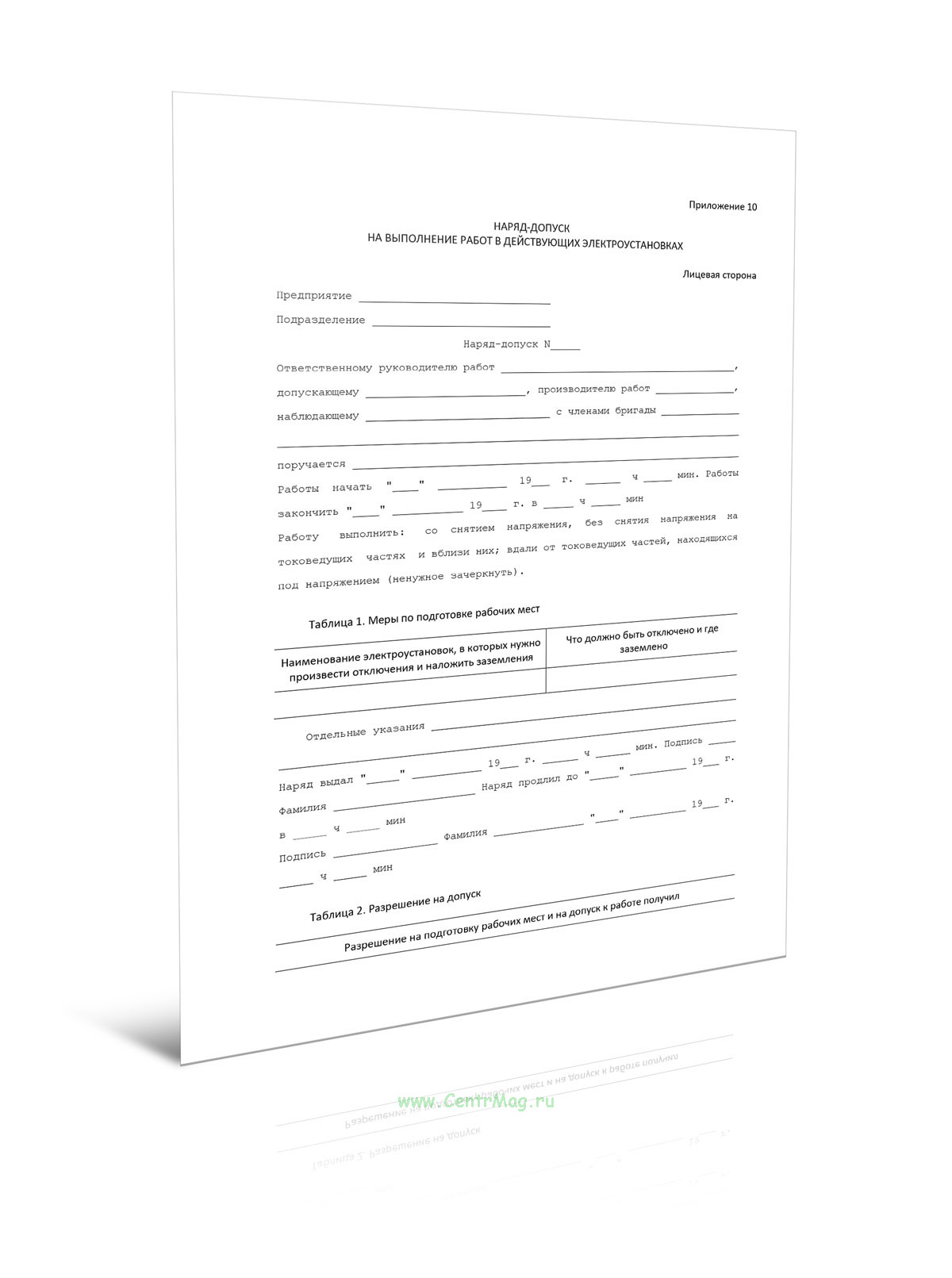 Форма Наряд-допуска на выполнение работ в действующих электроустановках соответствует Приложению № 10 к Правилам техники безопасности при электромонтажных и наладочных работах.
