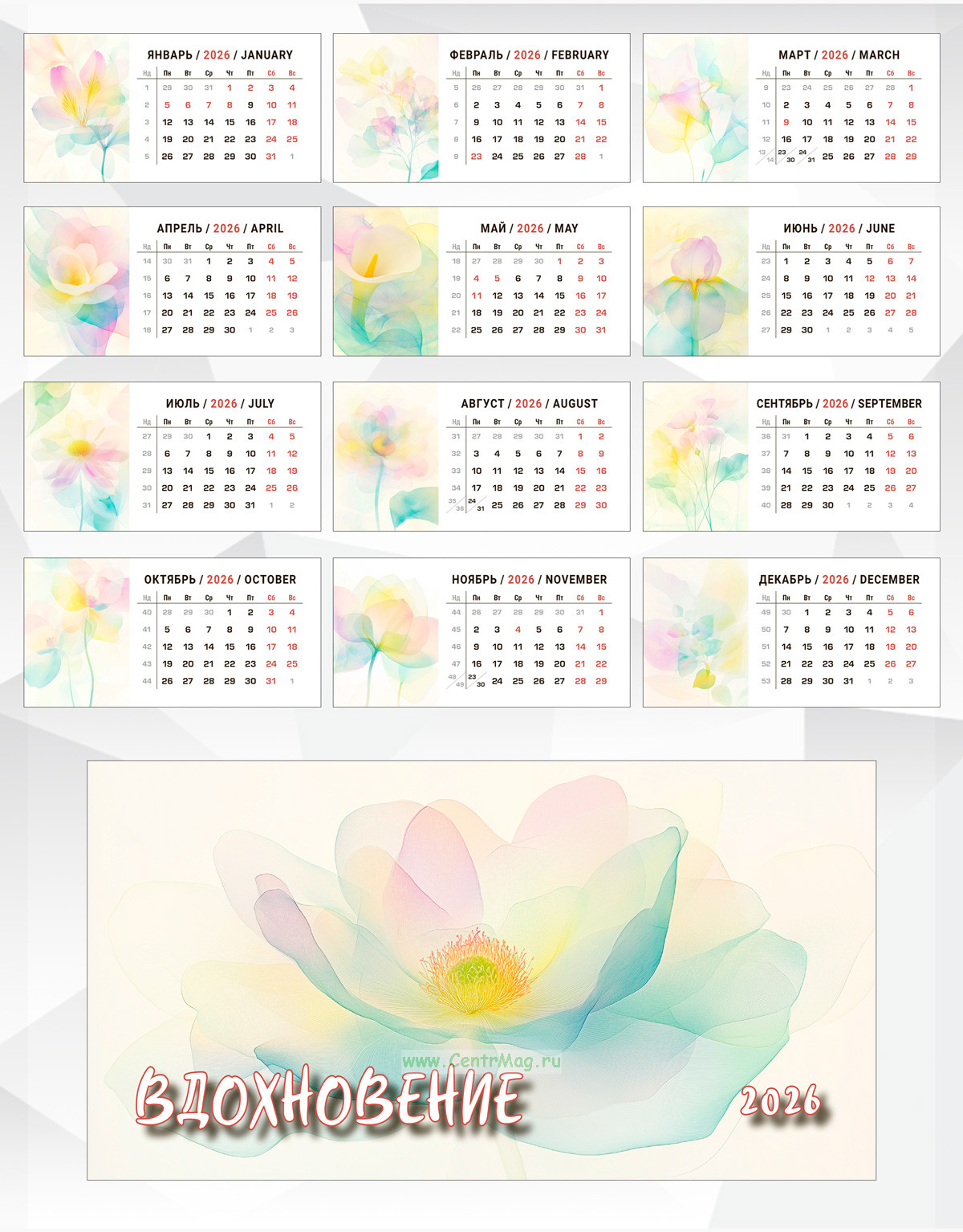 Календарь содержит очаровательные изображения цветов в воздушной технике вдохновения. Иллюстрации созданы с помощью искусственного интеллекта. Идеально подойдет в качестве подарка друзьям, родственникам или даже себе.