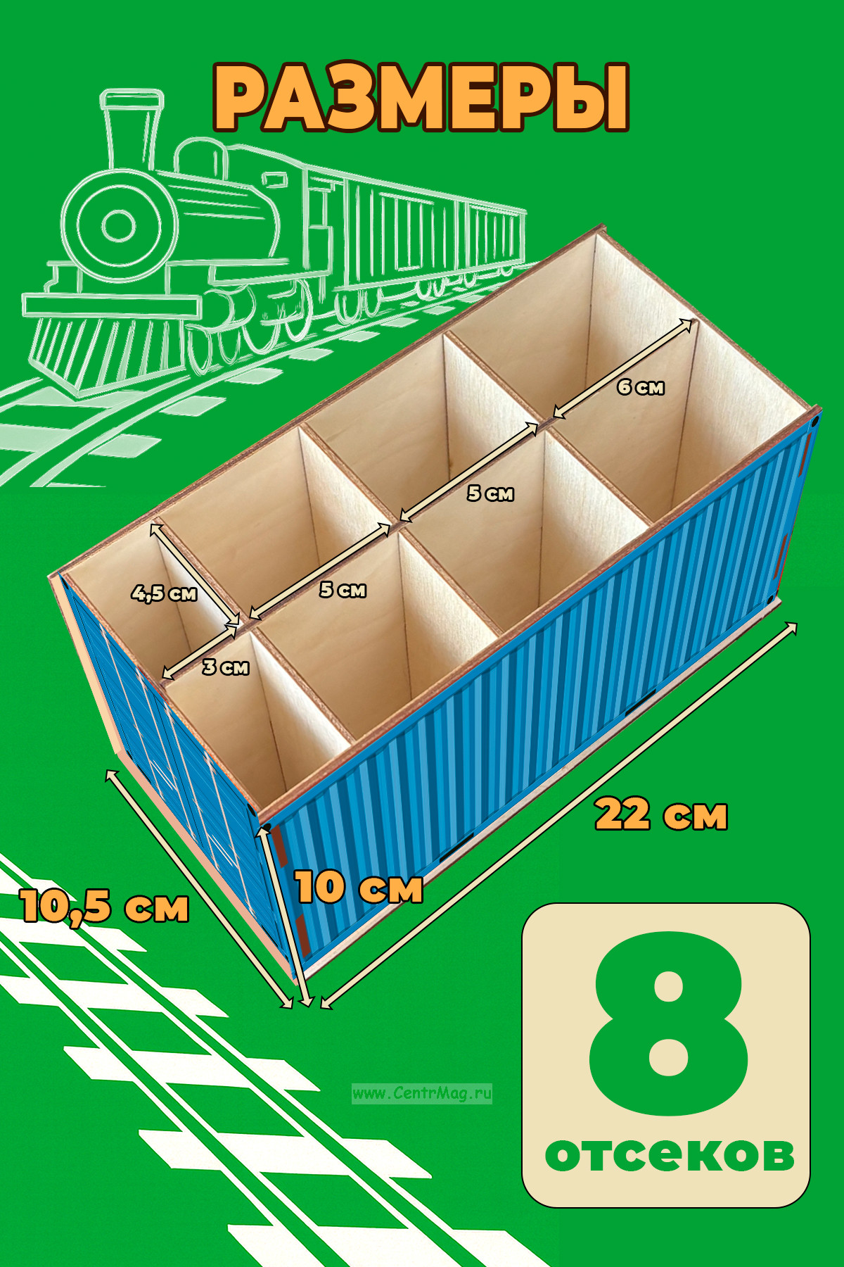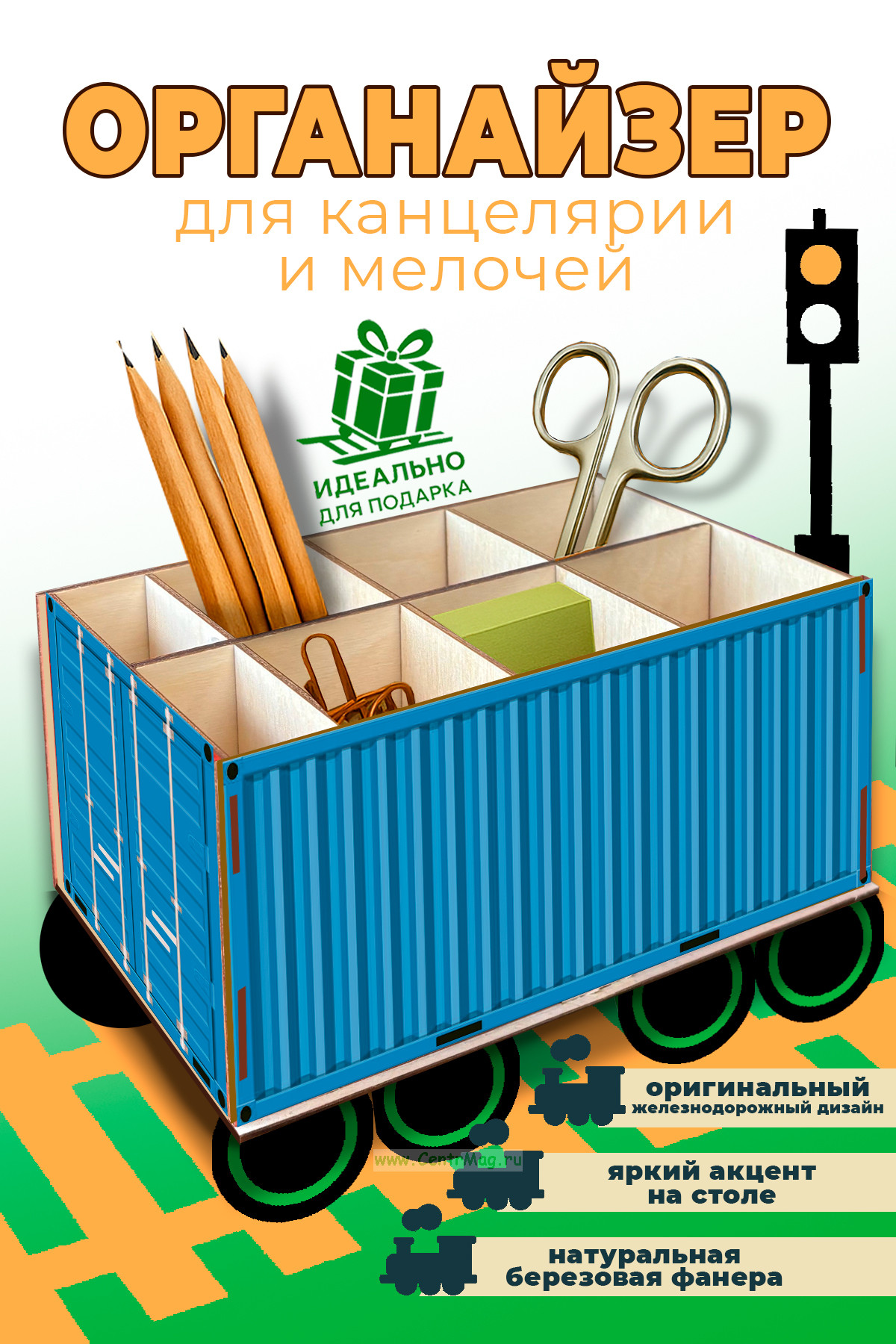 Стильный и функциональный органайзер в виде миниатюрного железнодорожного контейнера поможет навести порядок на столе и станет эффектным акцентом интерьера. Подходит для канцелярии и школьных принадлежностей, мелочей и аксессуаров.