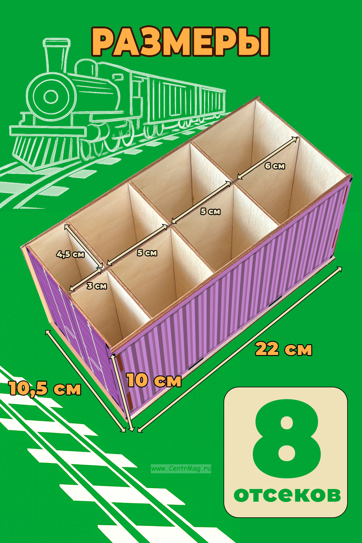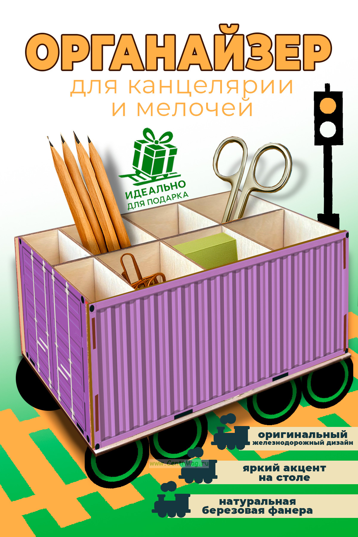 Стильный и функциональный органайзер в виде миниатюрного железнодорожного контейнера поможет навести порядок на столе и станет эффектным акцентом интерьера. Подходит для канцелярии и школьных принадлежностей, мелочей и аксессуаров.