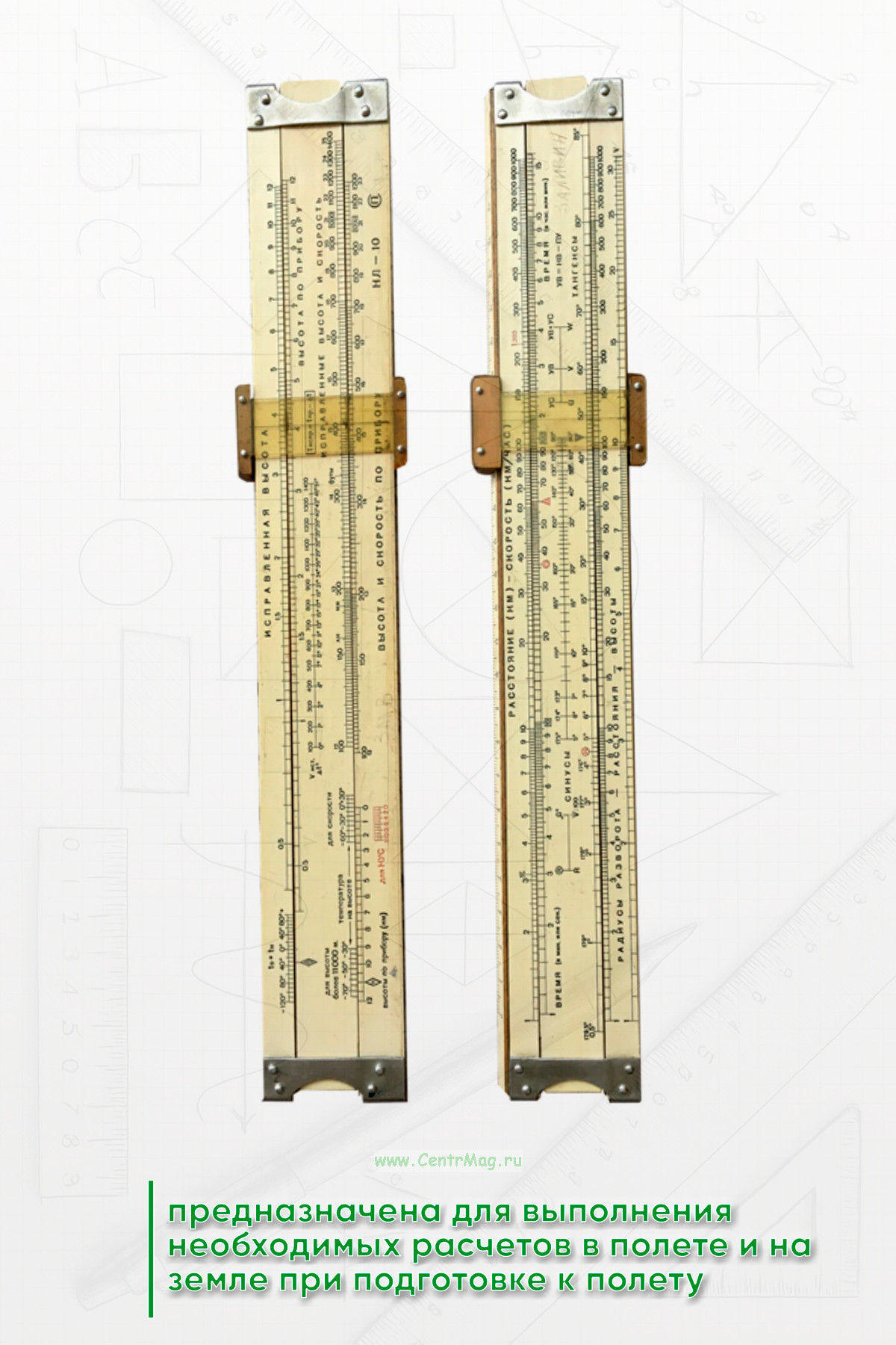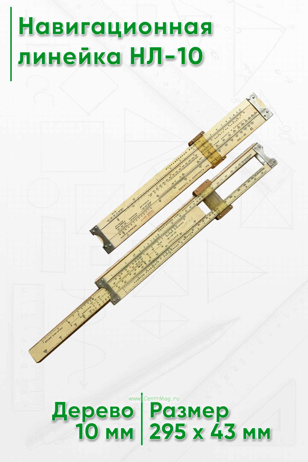 Навигационная счетная линейка НЛ-10 предназначена для выполнения необходимых расчетов в полете и на земле при подготовке к полету. Она обладает рядом достоинств. При сравнительно небольших габаритах счетная линейка позволяет довольно просто и с достаточной для практических вычислений точностью решать большинство задач по самолетовождению, бомбометанию, воздушной стрельбе и т. д.