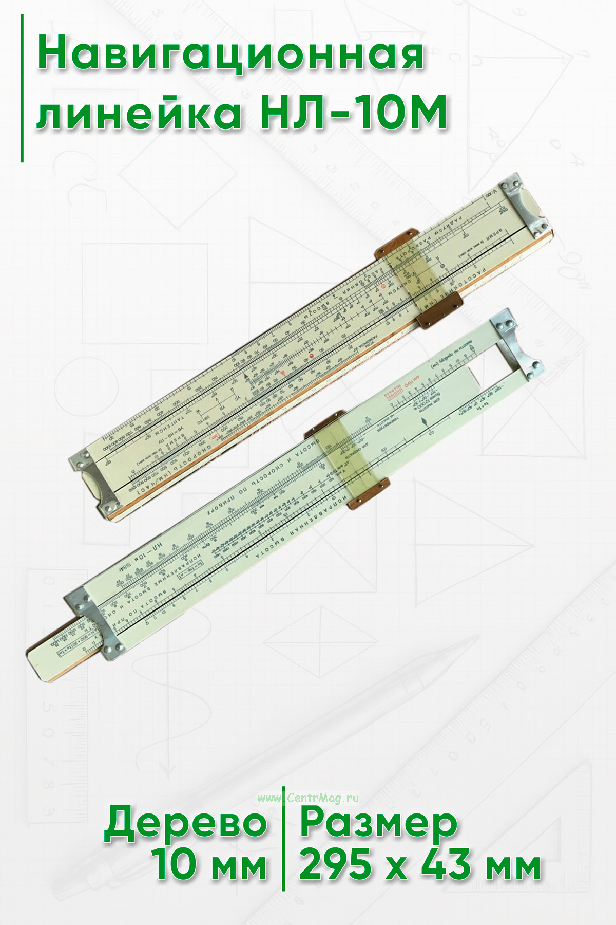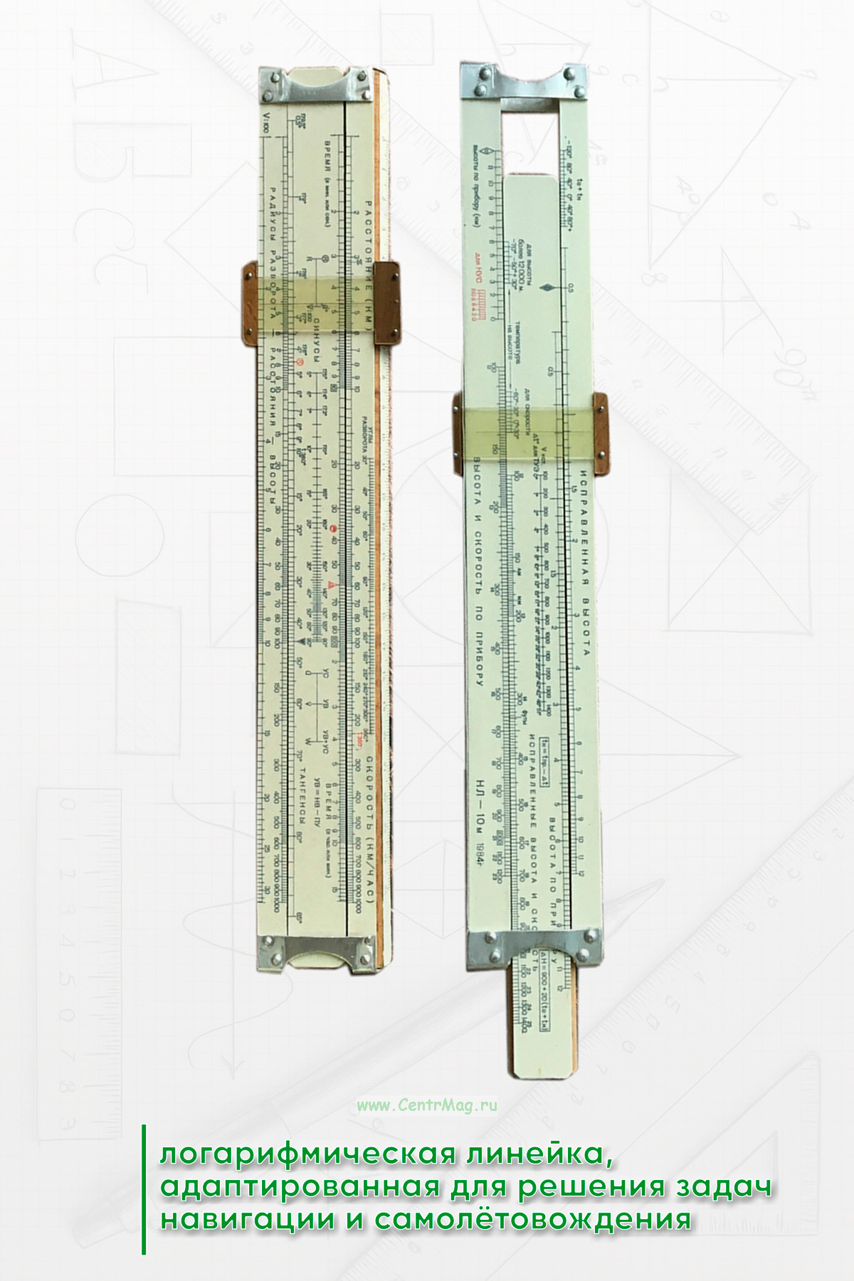 Навигационная линейка НЛ-10М. Логарифмическая линейка, адаптированная для решения задач навигации и самолётовождения. Состоит из корпуса, движка и визирки