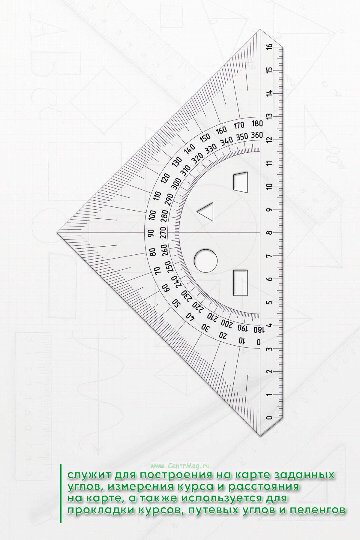 Навигационный угольник-транспортир служит для построения на карте заданных углов, измерения курса и расстояния на карте.