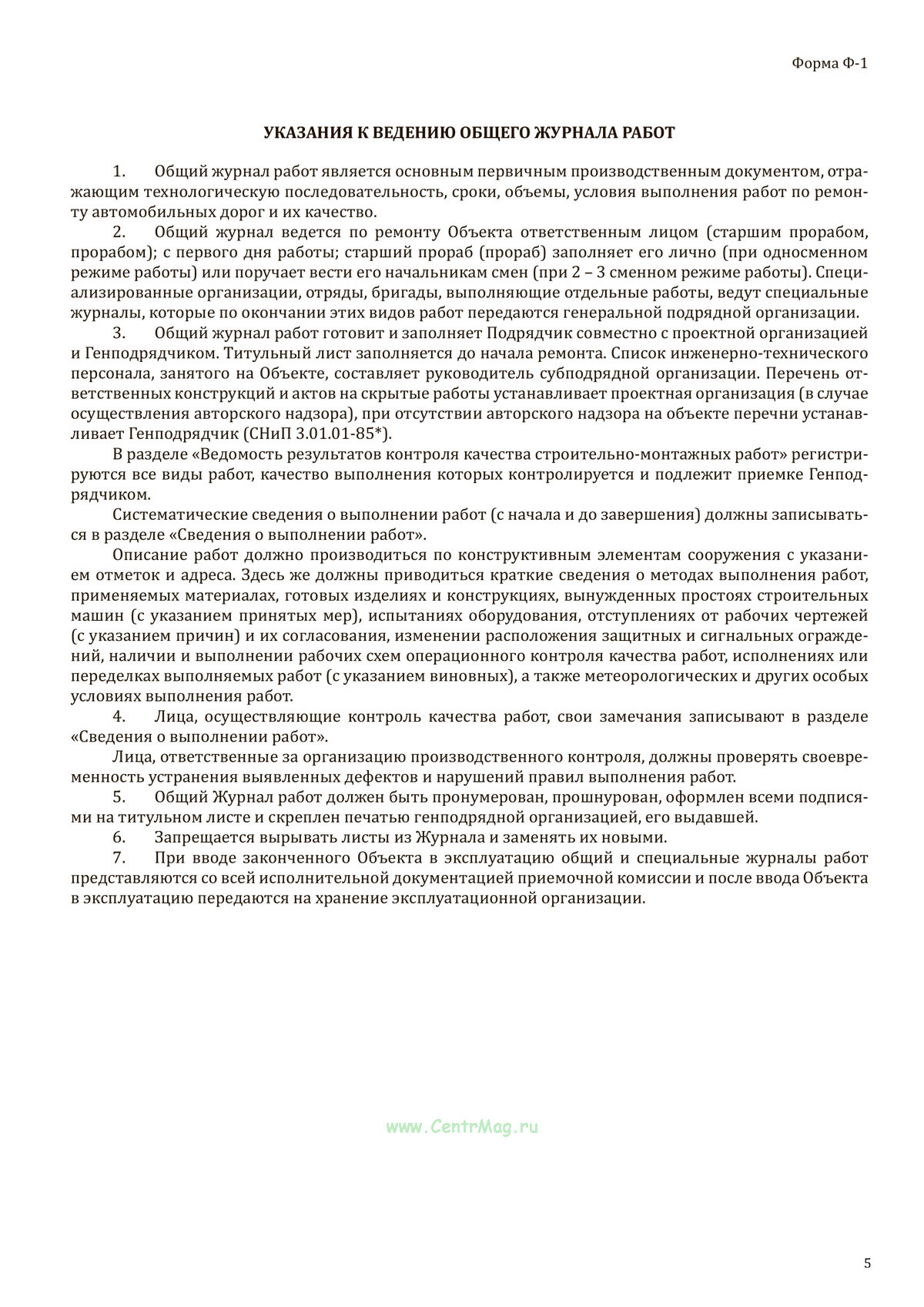 Общий журнал работ готовит и заполняет Подрядчик совместно с проектной организацией и Генподрядчиком. Титульный лист заполняется до начала ремонта. Список инженерно-технического персонала, занятого на Объекте, составляет руководитель субподрядной организации. Перечень ответственных конструкций и актов на скрытые работы устанавливает проектная организация (в случае осуществления авторского надзора), при отсутствии авторского надзора на объекте перечни устанавливает Генподрядчик (СНиП 3.01.01-85*).