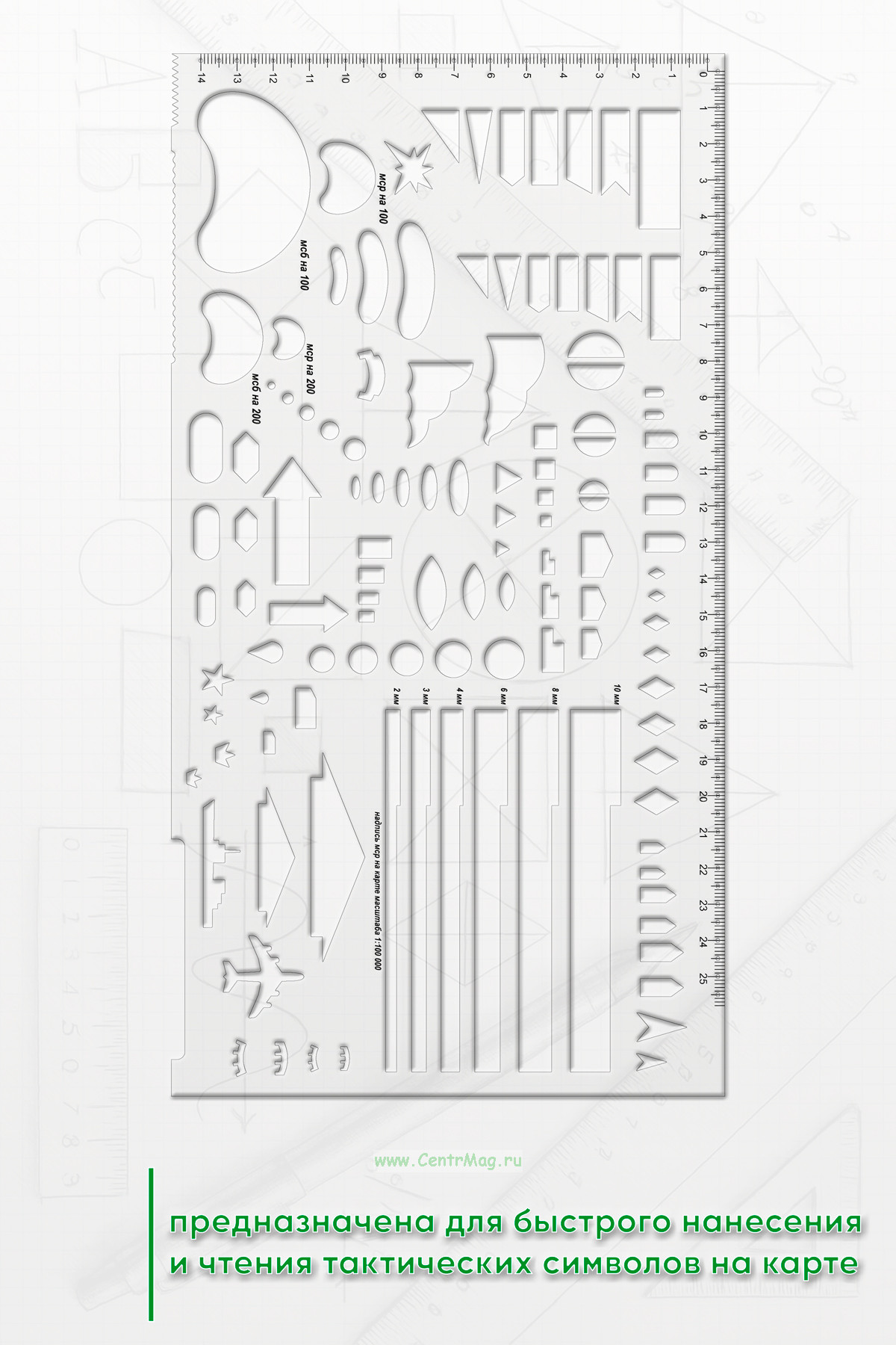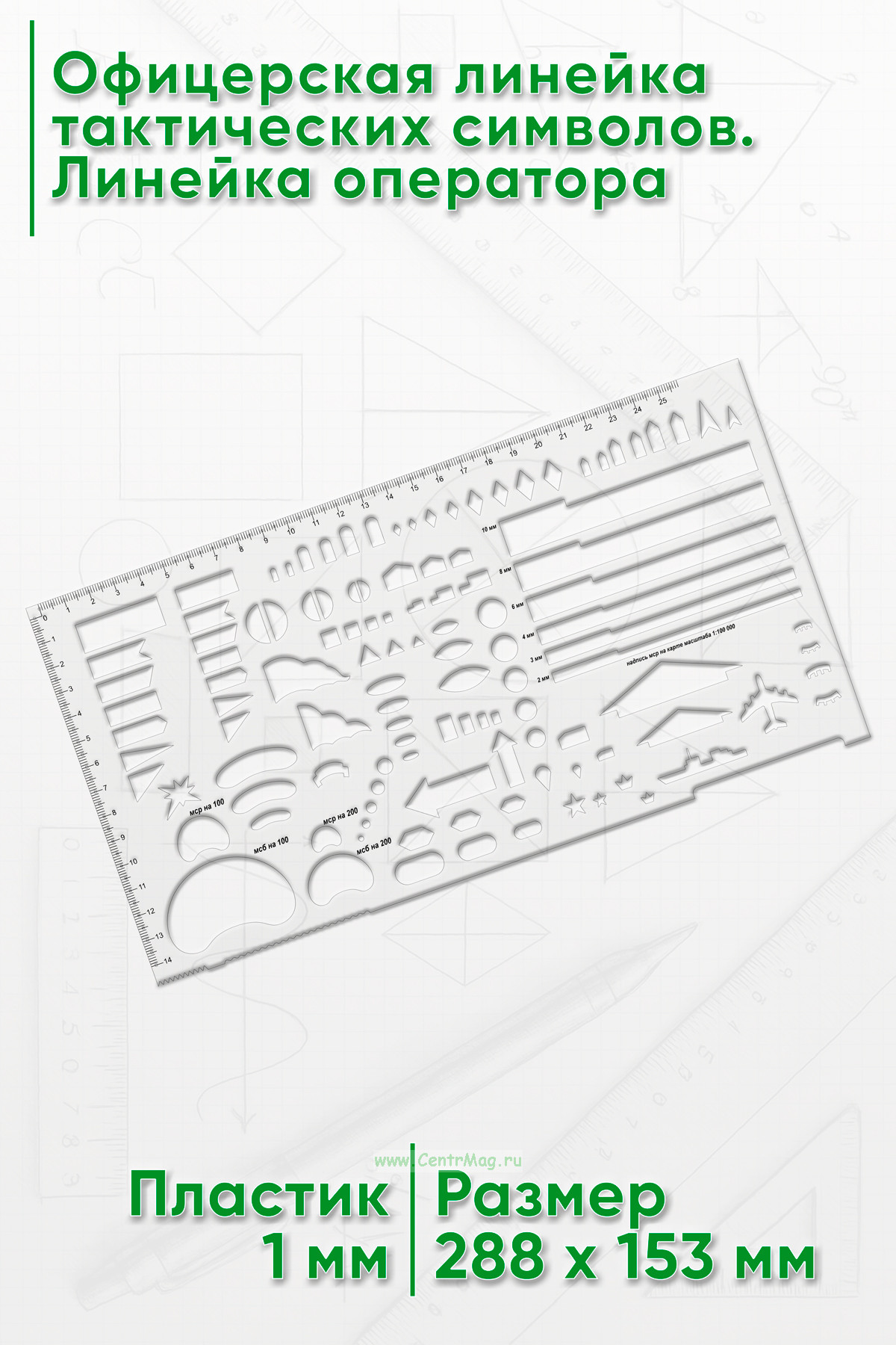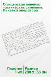 Офицерская линейка тактических символов предназначена для быстрого нанесения и чтения тактических символов на карте, таких как: обозначения подразделений, техники, направлений движения, рубежей, зон и объектов по стандартам военной топографии (в заданных масштабах).