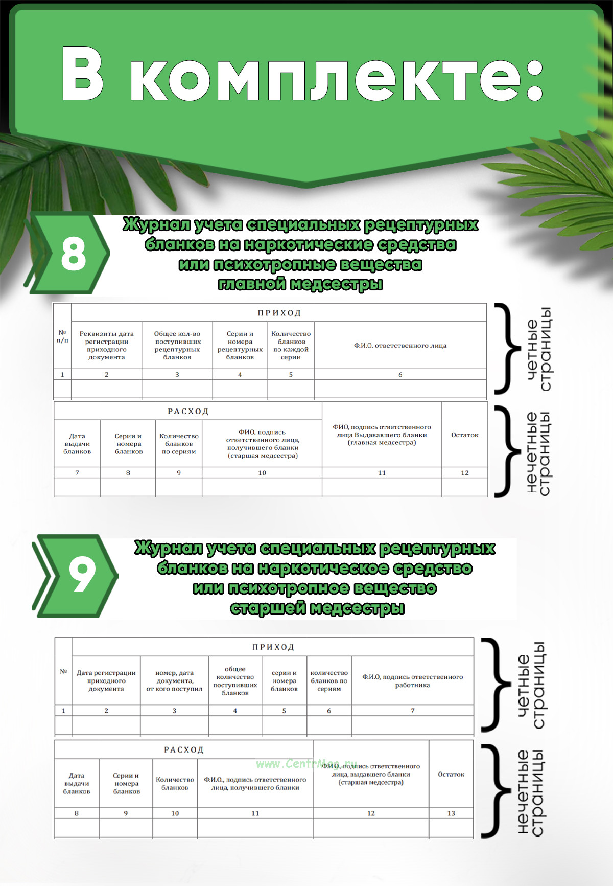 8. Журнал учета специальных рецептурных бланков на наркотическое средство или психотропное вещество главной медсестры амбулаторного отделения медицинской организации;