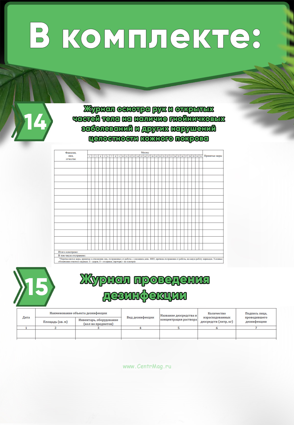 14. Журнал осмотра рук и открытых частей тела на наличие гнойничковых заболеваний и других нарушений целостности кожного покрова