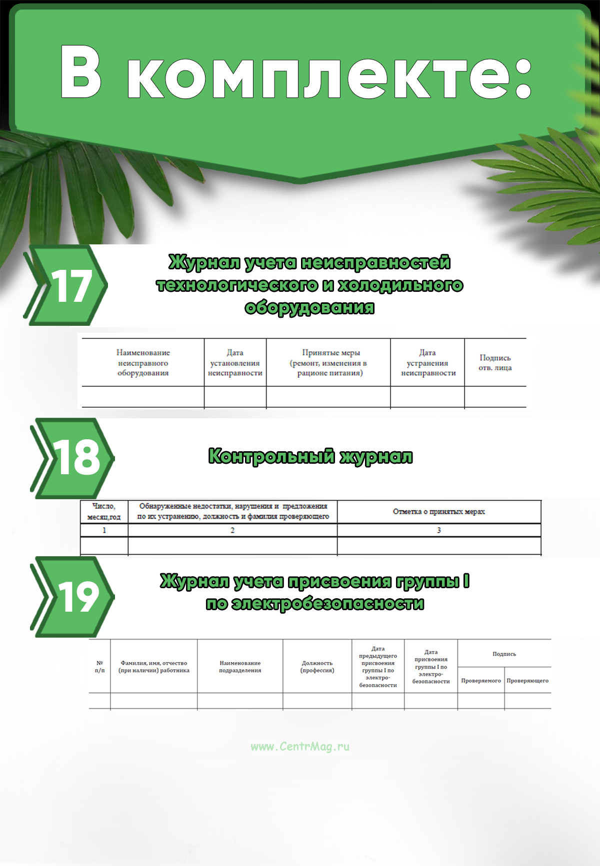 Для обеспечения работы необходимо также иметь комплект журналов по охране труда и пожарной безопасности.
