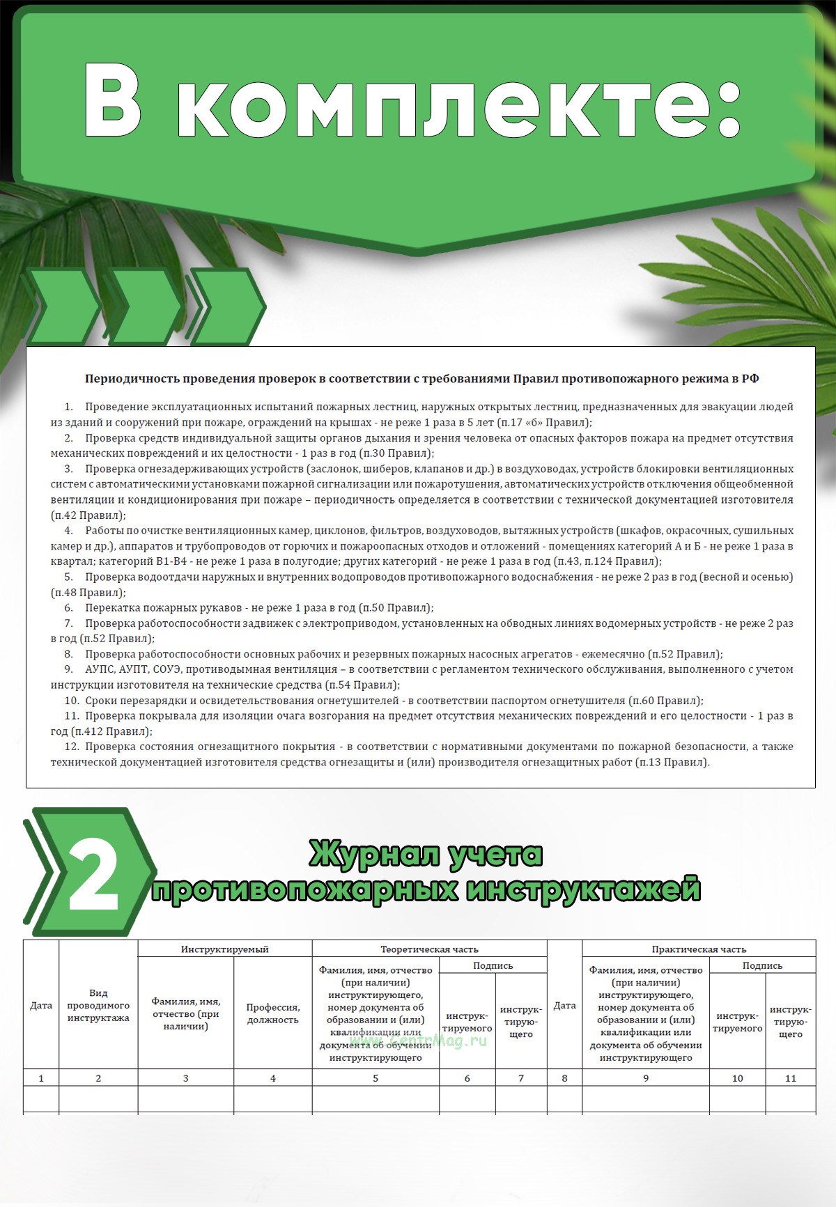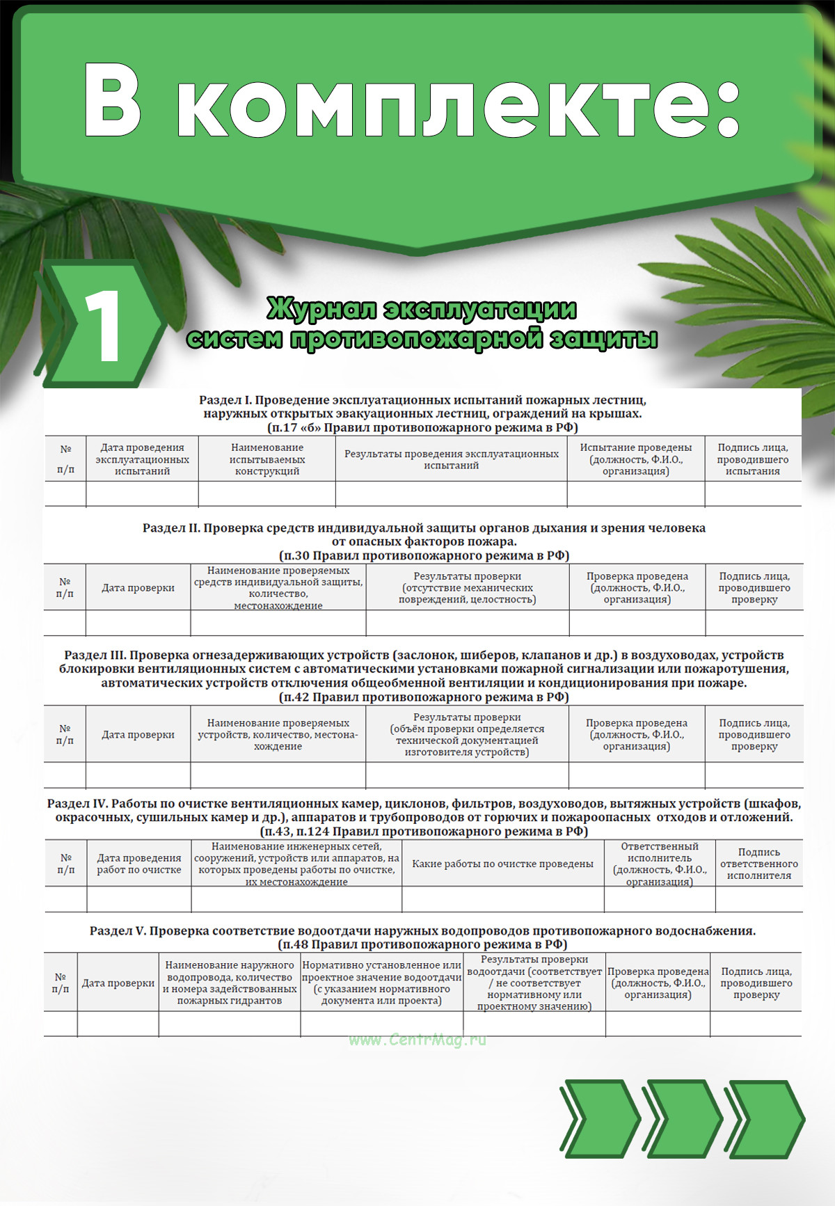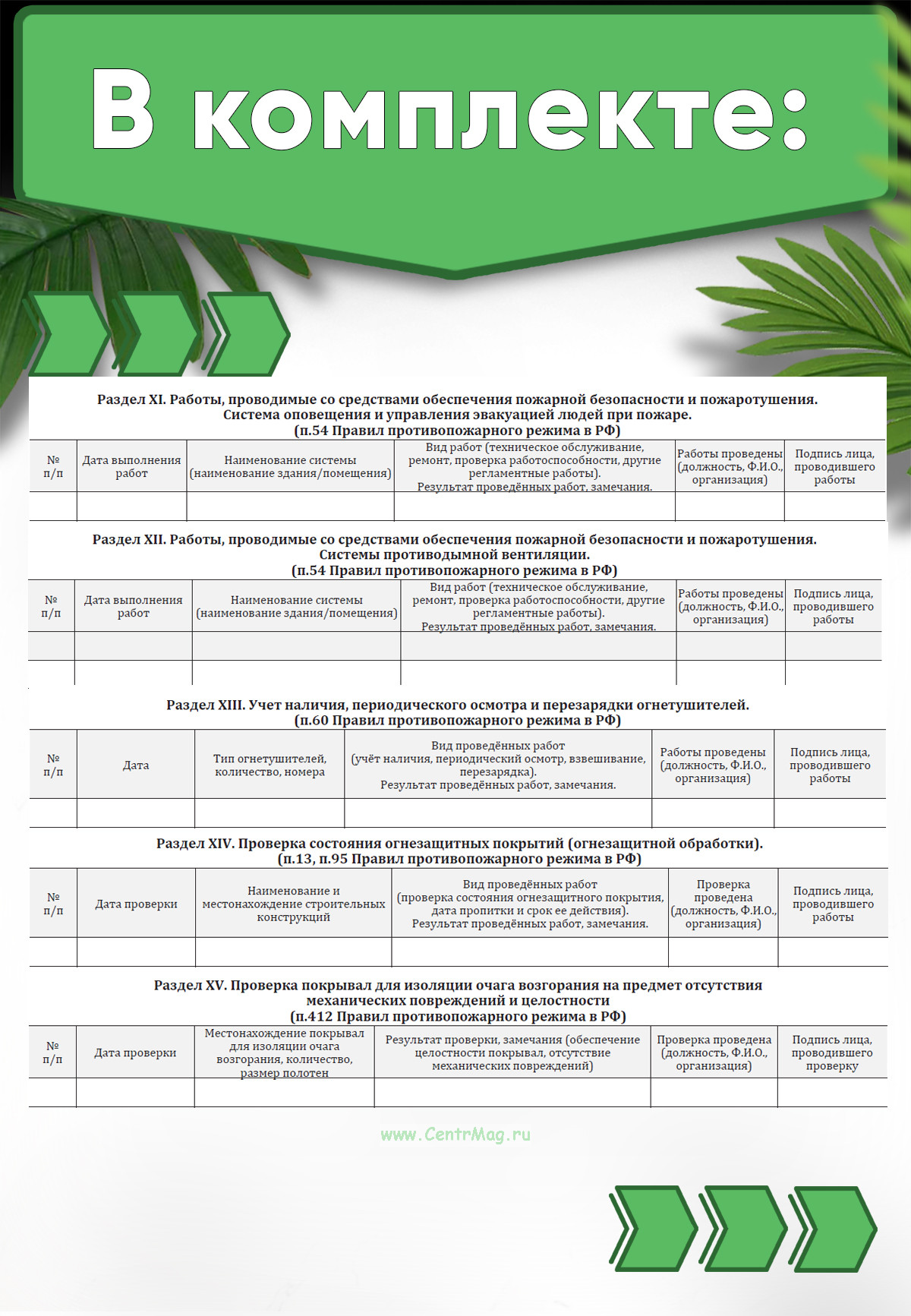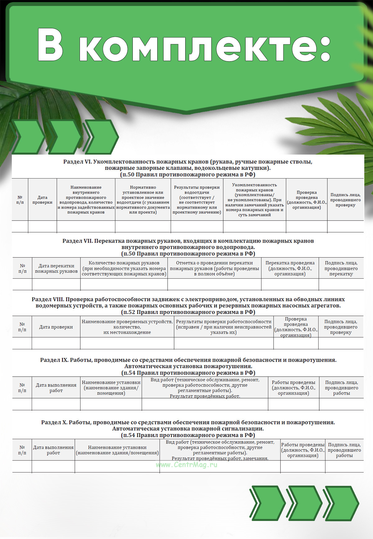 В комплект собраны самые необходимые журналы. Возможно Вашей организации необходимы и другие. Подробнее узнайте у Вашего инспектора государственного пожарного надзора.