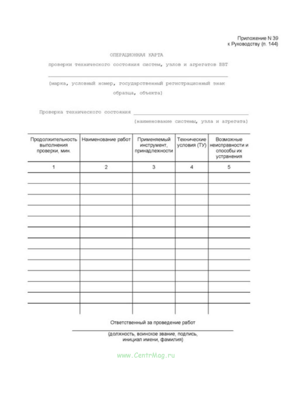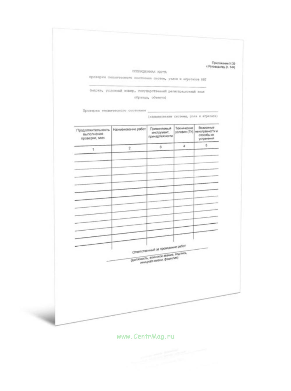 Форма Операционной карты проверки технического состояния систем, узлов и агрегатов ВВТ соответствует Приложению N 39 Приказу Министра обороны РФ от 28.12.2013 N 969 "Об утверждении Руководства по содержанию вооружения и военной техники общевойскового назначения, военно-технического имущества в Вооруженных Силах Российской Федерации".