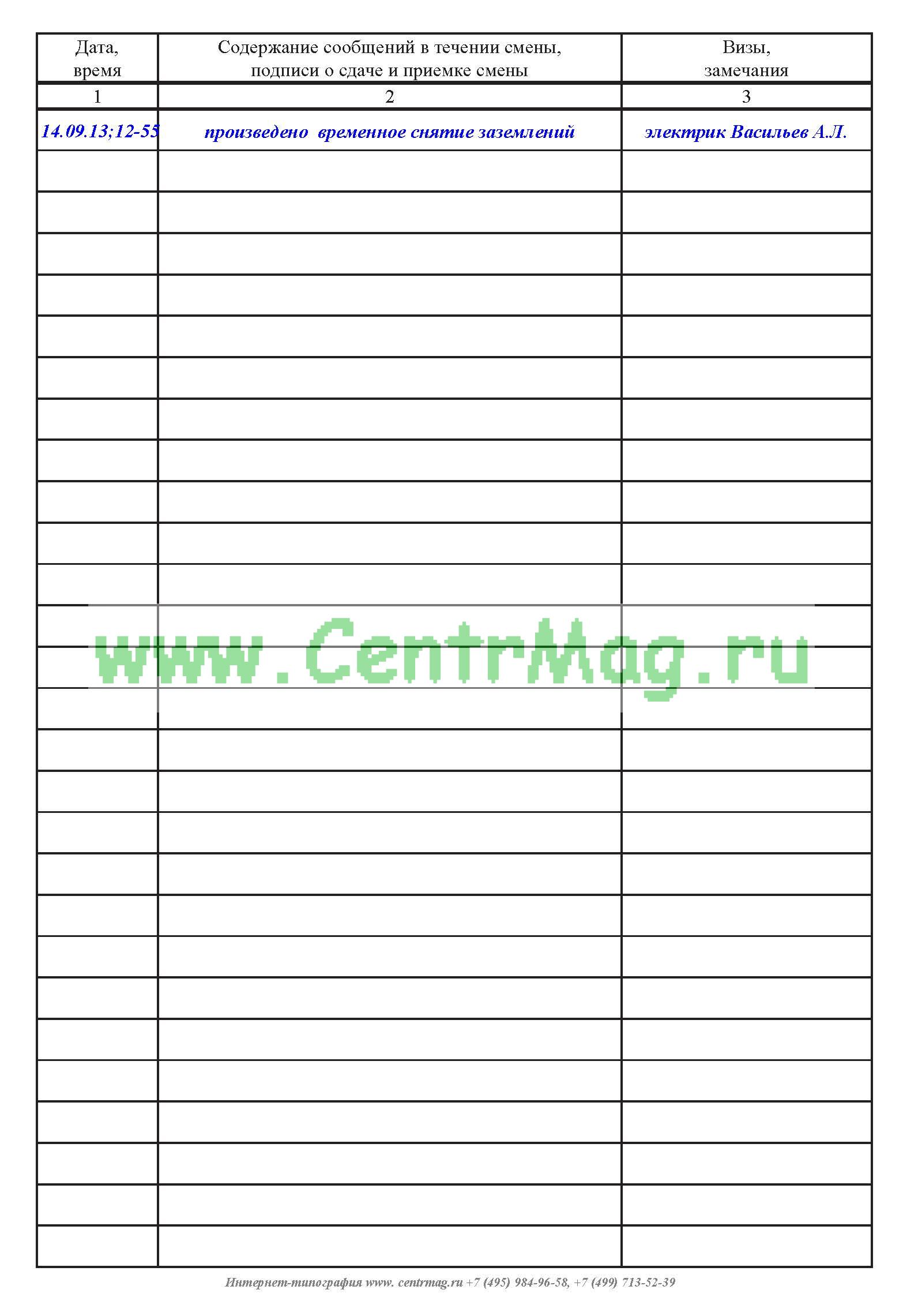 4. Во второй графе «Содержание сообщений …» записывается должность и фамилия лица с кем ведутся оперативные переговоры, содержание сообщений, распоряжений, указаний, полученных или отданных оперативным персоналом (начальником смены, дежурным диспетчером, дежурным электромонтером) или оперативно-ремонтным персоналом.